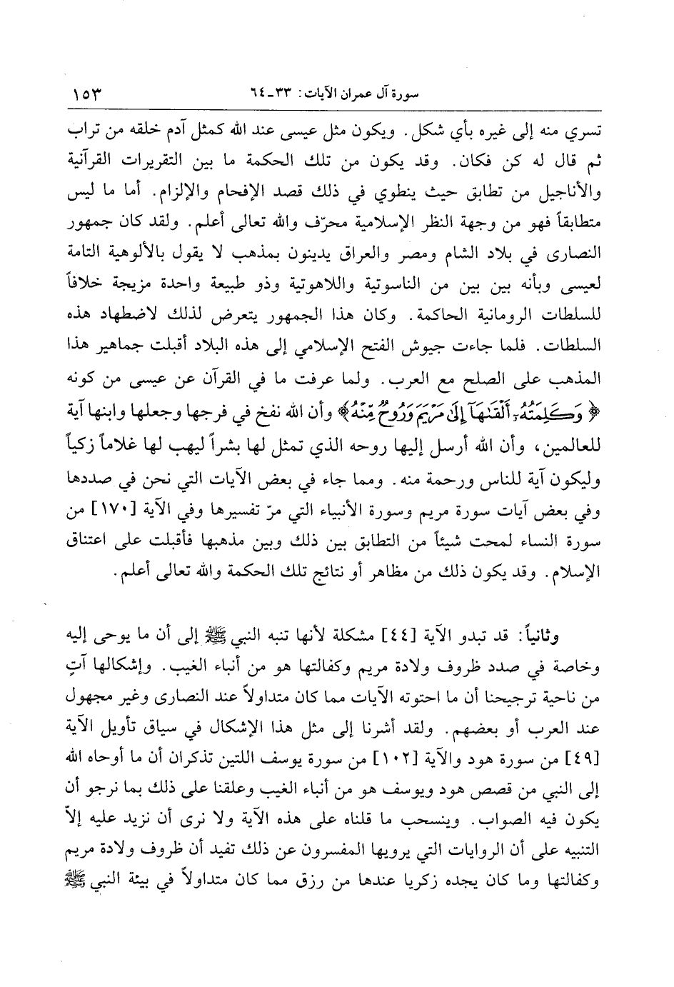 وثانيا: قد تبدو الآية [44] مشكلة لأنها تنبه النبي صلى الله عليه وسلم إلى أن ما يوحى إليه وخاصة في صدد ظروف ولادة مريم وكفالتها هو من أنباء الغيب. وإشكالها آت من ناحية ترجيحنا أن ما احتوته الآيات مما كان متداولا عند النصارى وغير مجهول عند العرب أو بعضهم. ولقد أشرنا إلى مثل هذا الإشكال في سياق تأويل الآية [49] من سورة هود والآية [102] من سورة يوسف اللتين تذكران أن ما أوحاه الله إلى النبي من قصص هود ويوسف هو من أنباء الغيب وعلقنا على ذلك بما نرجو أن يكون فيه الصواب. وينسحب ما قلناه على هذه الآية ولا نرى أن نزيد عليه إلّا التنبيه على أن الروايات التي يرويها المفسرون عن ذلك تفيد أن ظروف ولادة مريم وكفالتها وما كان يجده زكريا عندها من رزق مما كان متداولا في بيئة النبي صلى الله عليه وسلم