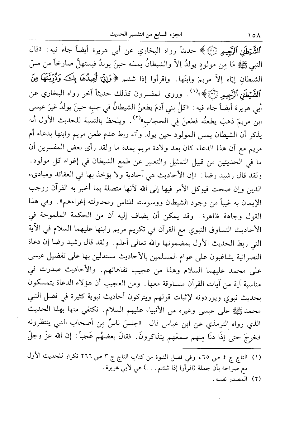 ولقد قال رشيد رضا: «إن الأحاديث هي آحادية ولا يؤخذ بها في العقائد ومبادئ الدين وإن صحت فيوكل الأمر فيها إلى الله لأنها متصلة بما أخبر به القرآن ووجب الإيمان به غيبا من وجود الشيطان ووسوسته للناس ومحاولته إغراءهم» . وفي هذا القول وجاهة ظاهرة. وقد يمكن أن يضاف إليه أن من الحكمة الملموحة في الأحاديث التساوق النبوي مع القرآن في تكريم مريم وابنها عليهما السلام في الآية التي ربط الحديث الأول بمضمونها والله تعالى أعلم. ولقد قال رشيد رضا إن دعاة النصرانية يشاغبون على عوام المسلمين بالأحاديث مستدلين بها على تفضيل عيسى على محمد عليهما السلام وهذا من عجيب تفاهاتهم. والأحاديث صدرت في مناسبة آية من آيات القرآن متساوقة معها. ومن العجيب أن هؤلاء الدعاة يتمسكون بحديث نبوي ويوردونه لإثبات قولهم ويتركون أحاديث نبوية كثيرة في فضل النبي محمد صلى الله عليه وسلم على عيسى وغيره من الأنبياء عليهم السلام. نكتفي منها بهذا الحديث الذي رواه الترمذي عن ابن عباس قال: «جلس ناس من أصحاب النبي ينتظرونه فخرج حتى إذا دنا منهم سمعهم يتذاكرون. فقال بعضهم عجبا: إن الله عزّ وجلّ