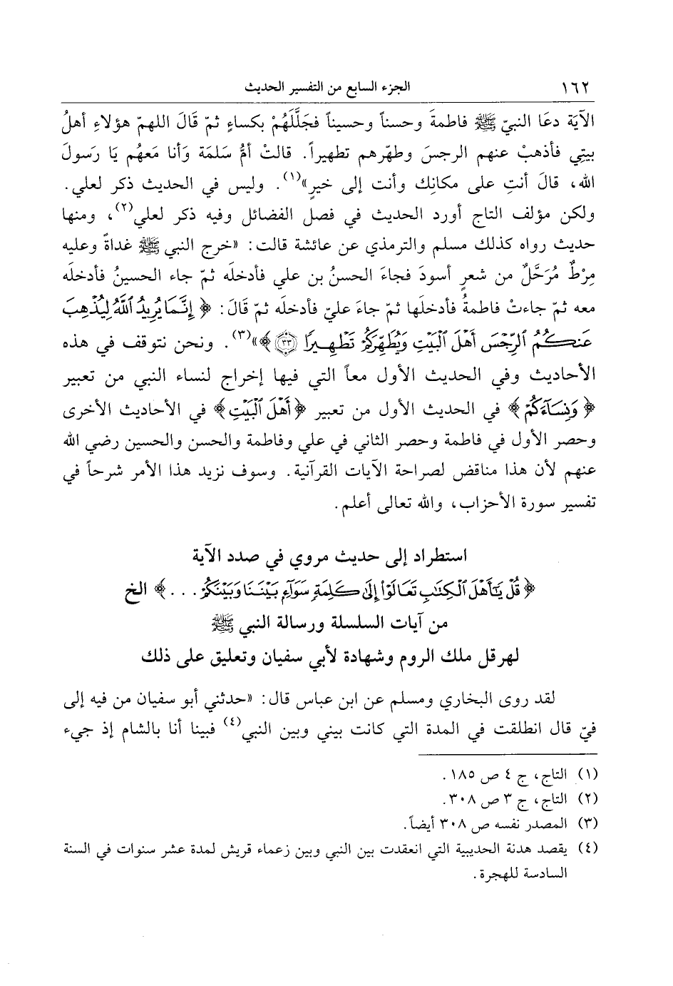 ولكن مؤلف التاج أورد الحديث في فصل الفضائل وفيه ذكر لعلي «2» ، ومنها حديث رواه كذلك مسلم والترمذي عن عائشة قالت: «خرج النبي صلى الله عليه وسلم غداة وعليه مرط مرحّل من شعر أسود فجاء الحسن بن علي فأدخله ثمّ جاء الحسين فأدخله معه ثمّ جاءت فاطمة فأدخلها ثمّ جاء عليّ فأدخله ثمّ قال: إِنَّما يُرِيدُ اللَّهُ لِيُذْهِبَ عَنْكُمُ الرِّجْسَ أَهْلَ الْبَيْتِ وَيُطَهِّرَكُمْ تَطْهِيراً (33) » «3» . ونحن نتوقف في هذه الأحاديث وفي الحديث الأول معا التي فيها إخراج لنساء النبي من تعبير وَنِساءَكُمْ في الحديث الأول من تعبير أَهْلَ الْبَيْتِ في الأحاديث الأخرى وحصر الأول في فاطمة وحصر الثاني في علي وفاطمة والحسن والحسين رضي الله عنهم لأن هذا مناقض لصراحة الآيات القرآنية. وسوف نزيد هذا الأمر شرحا في تفسير سورة الأحزاب، والله تعالى أعلم.