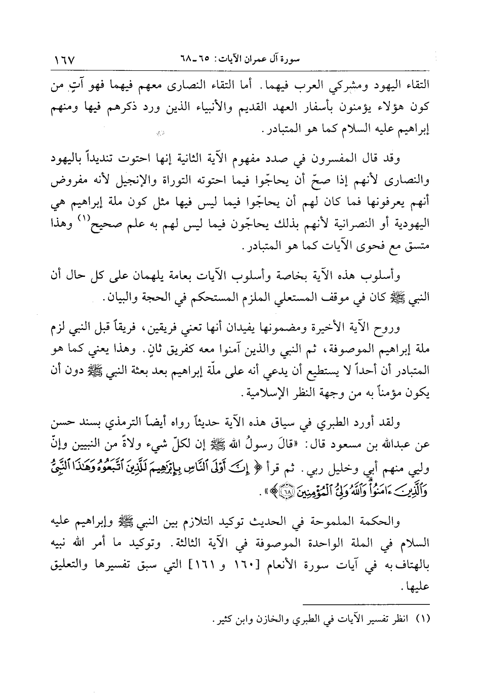 ولقد أورد الطبري في سياق هذه الآية حديثا رواه أيضا الترمذي بسند حسن عن عبد الله بن مسعود قال: «قال رسول الله صلى الله عليه وسلم إن لكلّ شيء ولاة من النبيين وإنّ وليي منهم أبي وخليل ربي. ثم قرأ إِنَّ أَوْلَى النَّاسِ بِإِبْراهِيمَ لَلَّذِينَ اتَّبَعُوهُ وَهذَا النَّبِيُّ وَالَّذِينَ آمَنُوا وَاللَّهُ وَلِيُّ الْمُؤْمِنِينَ (68) » .