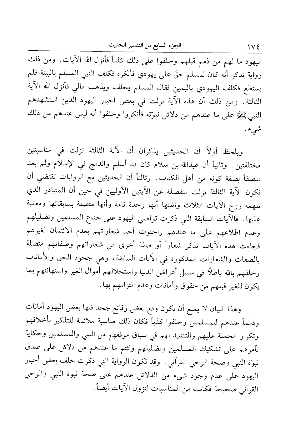 وهذا البيان لا يمنع أن يكون وقع بعض وقائع جحد فيها بعض اليهود أمانات وذمما عندهم للمسلمين وحلفوا كذبا فكان ذلك مناسبة ملائمة للتذكير بأخلاقهم وتكرار الحملة عليهم والتنديد بهم في سياق موقفهم من النبي والمسلمين وحكاية تآمرهم على تشكيك المسلمين وتضليلهم وكتم ما عندهم من دلائل على صدق نبوّة النبي وصحة الوحي القرآني. وقد تكون الرواية التي ذكرت حلف بعض أحبار اليهود على عدم وجود شيء من الدلائل عندهم على صحة نبوة النبي والوحي القرآني صحيحة فكانت من المناسبات لنزول الآيات أيضا.