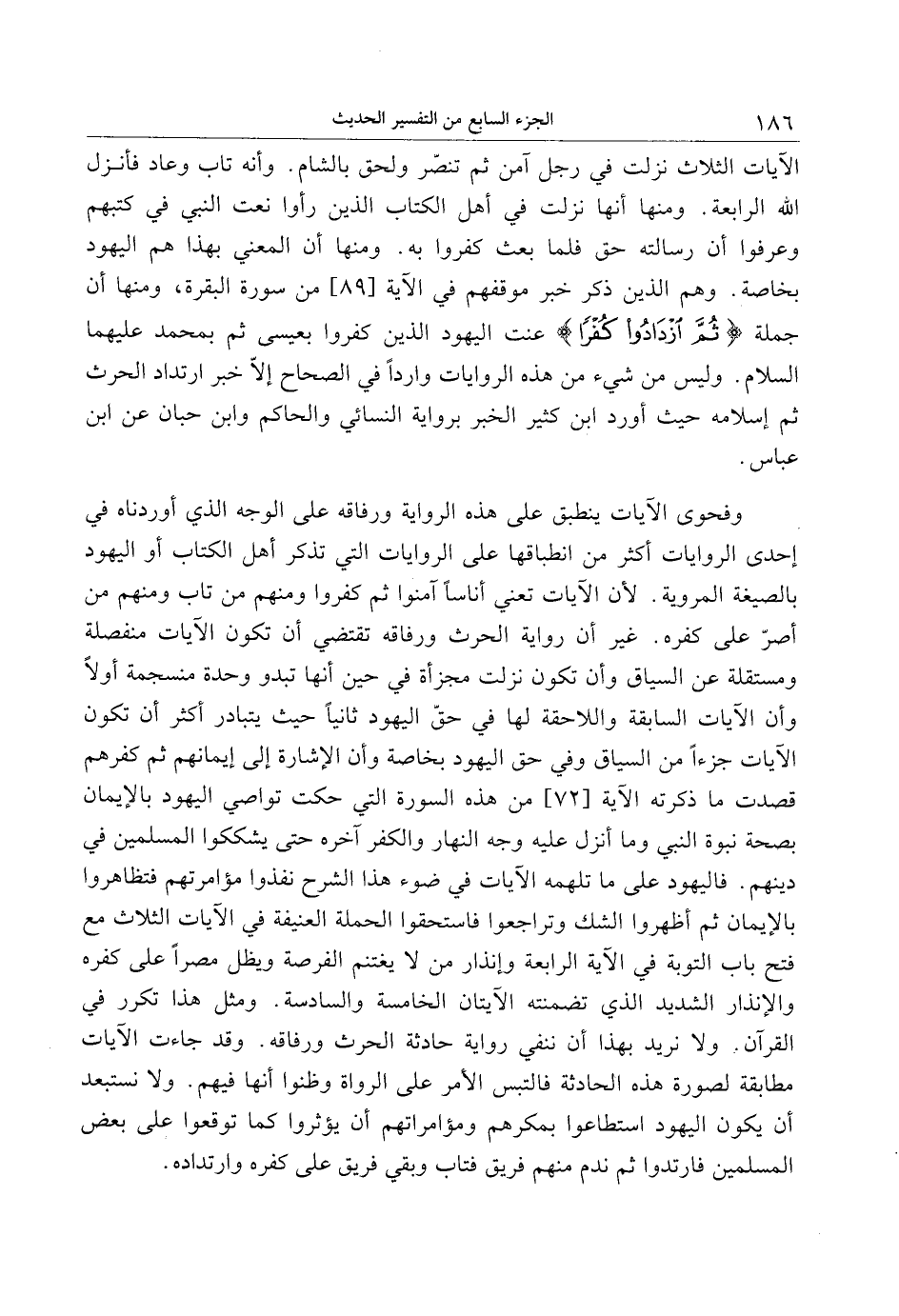 وفحوى الآيات ينطبق على هذه الرواية ورفاقه على الوجه الذي أوردناه في إحدى الروايات أكثر من انطباقها على الروايات التي تذكر أهل الكتاب أو اليهود بالصيغة المروية. لأن الآيات تعني أناسا آمنوا ثم كفروا ومنهم من تاب ومنهم من أصرّ على كفره. غير أن رواية الحرث ورفاقه تقتضي أن تكون الآيات منفصلة ومستقلة عن السياق وأن تكون نزلت مجزأة في حين أنها تبدو وحدة منسجمة أولا وأن الآيات السابقة واللاحقة لها في حقّ اليهود ثانيا حيث يتبادر أكثر أن تكون الآيات جزاءا من السياق وفي حق اليهود بخاصة وأن الإشارة إلى إيمانهم ثم كفرهم قصدت ما ذكرته الآية [72] من هذه السورة التي حكت تواصي اليهود بالإيمان بصحة نبوة النبي وما أنزل عليه وجه النهار والكفر آخره حتى يشككوا المسلمين في دينهم. فاليهود على ما تلهمه الآيات في ضوء هذا الشرح نفذوا مؤامرتهم فتظاهروا بالإيمان ثم أظهروا الشك وتراجعوا فاستحقوا الحملة العنيفة في الآيات الثلاث مع فتح باب التوبة في الآية الرابعة وإنذار من لا يغتنم الفرصة ويظل مصرا على كفره والإنذار الشديد الذي تضمنته الآيتان الخامسة والسادسة. ومثل هذا تكرر في القرآن. ولا نريد بهذا أن ننفي رواية حادثة الحرث ورفاقه. وقد جاءت الآيات مطابقة لصورة هذه الحادثة فالتبس الأمر على الرواة وظنوا أنها فيهم. ولا نستبعد أن يكون اليهود استطاعوا بمكرهم ومؤامراتهم أن يؤثروا كما توقعوا على بعض المسلمين فارتدوا ثم ندم منهم فريق فتاب وبقي فريق على كفره وارتداده.
