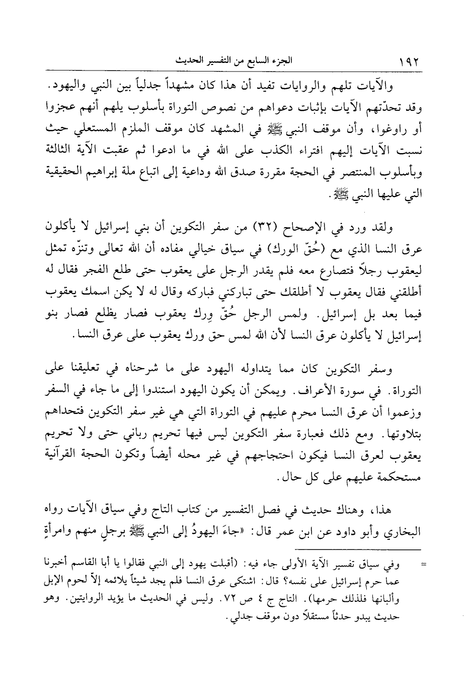 وسفر التكوين كان مما يتداوله اليهود على ما شرحناه في تعليقنا على التوراة. في سورة الأعراف. ويمكن أن يكون اليهود استندوا إلى ما جاء في السفر وزعموا أن عرق النسا محرم عليهم في التوراة التي هي غير سفر التكوين فتحداهم بتلاوتها. ومع ذلك فعبارة سفر التكوين ليس فيها تحريم رباني حتى ولا تحريم يعقوب لعرق النسا فيكون احتجاجهم في غير محله أيضا وتكون الحجة القرآنية مستحكمة عليهم على كل حال.