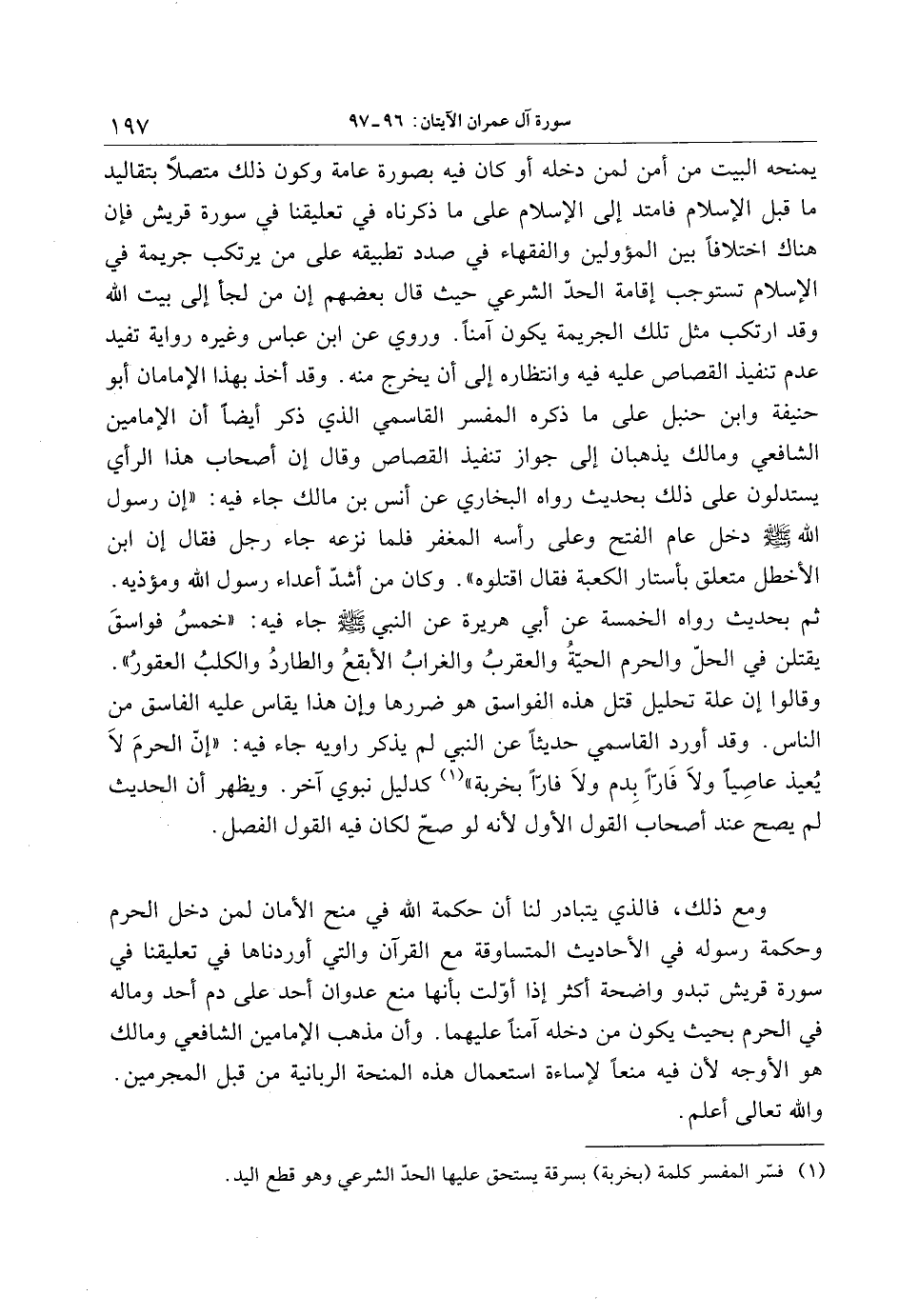 ومع ذلك، فالذي يتبادر لنا أن حكمة الله في منح الأمان لمن دخل الحرم وحكمة رسوله في الأحاديث المتساوقة مع القرآن والتي أوردناها في تعليقنا في سورة قريش تبدو واضحة أكثر إذا أوّلت بأنها منع عدوان أحد على دم أحد وماله في الحرم بحيث يكون من دخله آمنا عليهما. وأن مذهب الإمامين الشافعي ومالك هو الأوجه لأن فيه منعا لإساءة استعمال هذه المنحة الربانية من قبل المجرمين.