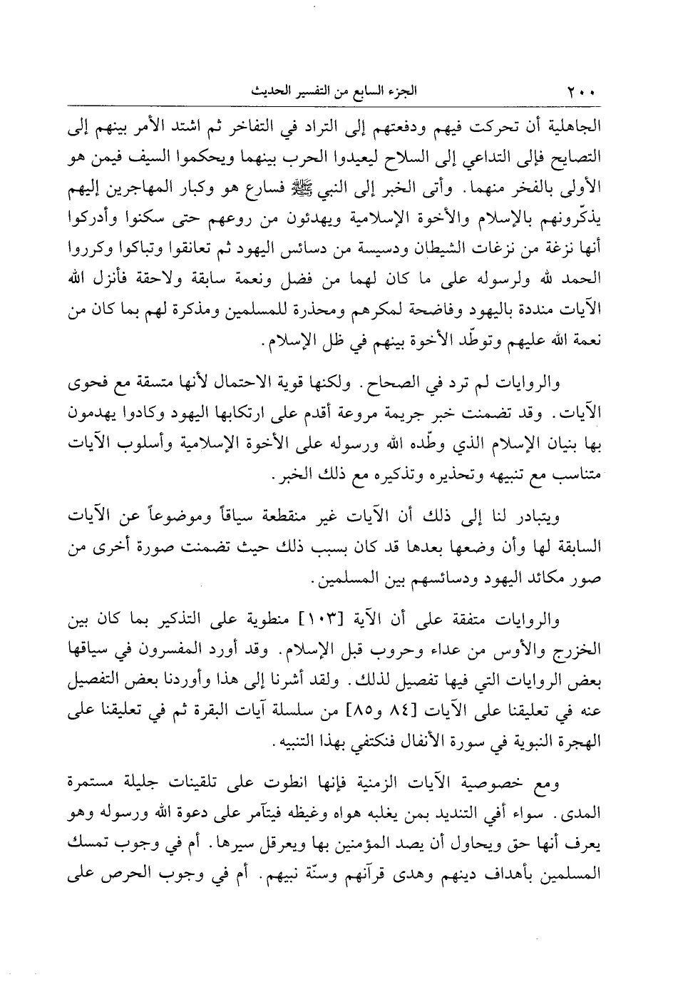 الجاهلية أن تحركت فيهم ودفعتهم إلى التراد في التفاخر ثم اشتد الأمر بينهم إلى التصايح فإلى التداعي إلى السلاح ليعيدوا الحرب بينهما ويحكموا السيف فيمن هو الأولى بالفخر منهما. وأتى الخبر إلى النبي صلى الله عليه وسلم فسارع هو وكبار المهاجرين إليهم يذكّرونهم بالإسلام والأخوة الإسلامية ويهدئون من روعهم حتى سكنوا وأدركوا أنها نزغة من نزغات الشيطان ودسيسة من دسائس اليهود ثم تعانقوا وتباكوا وكرروا الحمد لله ولرسوله على ما كان لهما من فضل ونعمة سابقة ولا حقة فأنزل الله الآيات منددة باليهود وفاضحة لمكرهم ومحذرة للمسلمين ومذكرة لهم بما كان من نعمة الله عليهم وتوطّد الأخوة بينهم في ظل الإسلام.