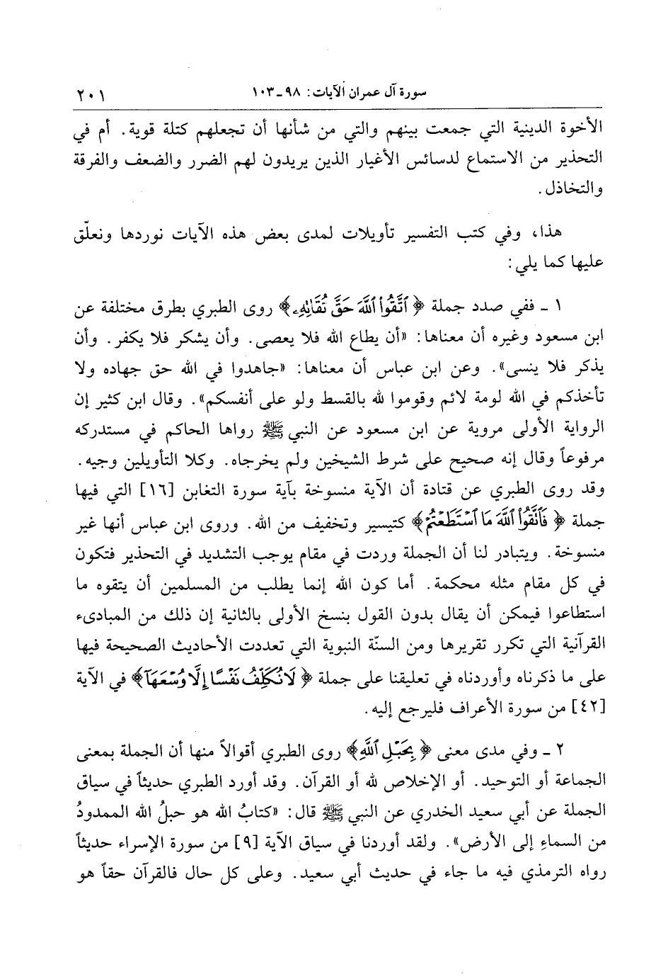 1- ففي صدد جملة اتَّقُوا اللَّهَ حَقَّ تُقاتِهِ روى الطبري بطرق مختلفة عن ابن مسعود وغيره أن معناها: «أن يطاع الله فلا يعصى. وأن يشكر فلا يكفر. وأن يذكر فلا ينسى» . وعن ابن عباس أن معناها: «جاهدوا في الله حق جهاده ولا تأخذكم في الله لومة لائم وقوموا لله بالقسط ولو على أنفسكم» . وقال ابن كثير إن الرواية الأولى مروية عن ابن مسعود عن النبي صلى الله عليه وسلم رواها الحاكم في مستدركه مرفوعا وقال إنه صحيح على شرط الشيخين ولم يخرجاه. وكلا التأويلين وجيه.