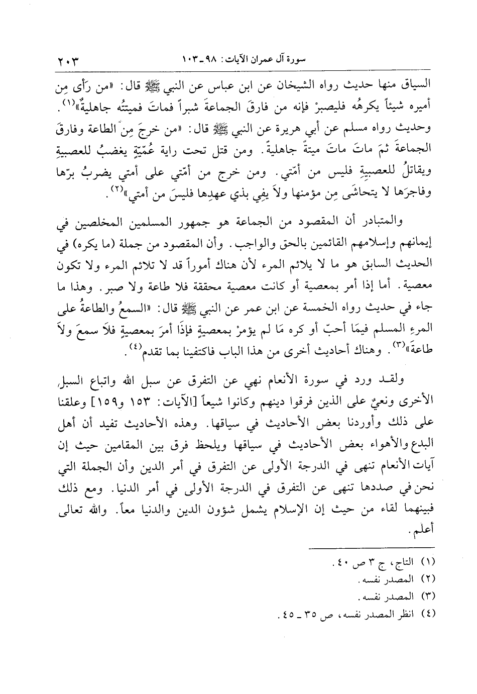 والمتبادر أن المقصود من الجماعة هو جمهور المسلمين المخلصين في إيمانهم وإسلامهم القائمين بالحق والواجب. وأن المقصود من جملة (ما يكره) في الحديث السابق هو ما لا يلائم المرء لأن هناك أمورا قد لا تلائم المرء ولا تكون معصية. أما إذا أمر بمعصية أو كانت معصية محققة فلا طاعة ولا صبر. وهذا ما جاء في حديث رواه الخمسة عن ابن عمر عن النبي صلى الله عليه وسلم قال: «السمع والطاعة على المرء المسلم فيما أحبّ أو كره ما لم يؤمر بمعصية فإذا أمر بمعصية فلا سمع ولا طاعة» «3» . وهناك أحاديث أخرى من هذا الباب فاكتفينا بما تقدم «4» .