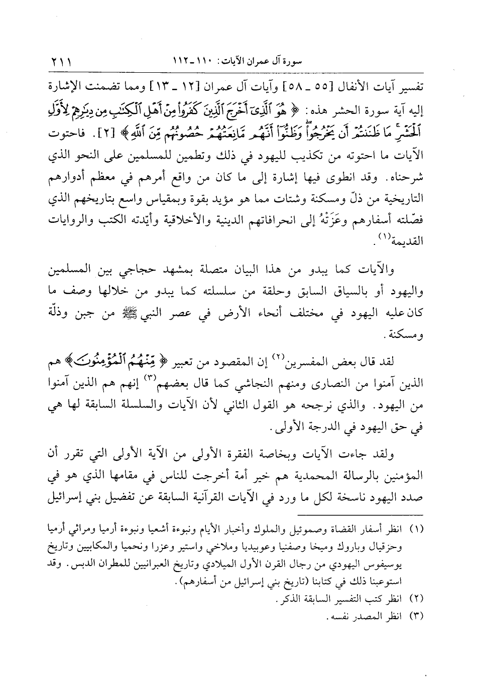 تفسير آيات الأنفال [55- 58] وآيات آل عمران [12- 13] ومما تضمنت الإشارة إليه آية سورة الحشر هذه: هُوَ الَّذِي أَخْرَجَ الَّذِينَ كَفَرُوا مِنْ أَهْلِ الْكِتابِ مِنْ دِيارِهِمْ لِأَوَّلِ الْحَشْرِ ما ظَنَنْتُمْ أَنْ يَخْرُجُوا وَظَنُّوا أَنَّهُمْ مانِعَتُهُمْ حُصُونُهُمْ مِنَ اللَّهِ [2] . فاحتوت الآيات ما احتوته من تكذيب لليهود في ذلك وتطمين للمسلمين على النحو الذي شرحناه. وقد انطوى فيها إشارة إلى ما كان من واقع أمرهم في معظم أدوارهم التاريخية من ذلّ ومسكنة وشتات مما هو مؤيد بقوة وبمقياس واسع بتاريخهم الذي فصّلته أسفارهم وعزته إلى انحرافاتهم الدينية والأخلاقية وأيّدته الكتب والروايات القديمة «1» .