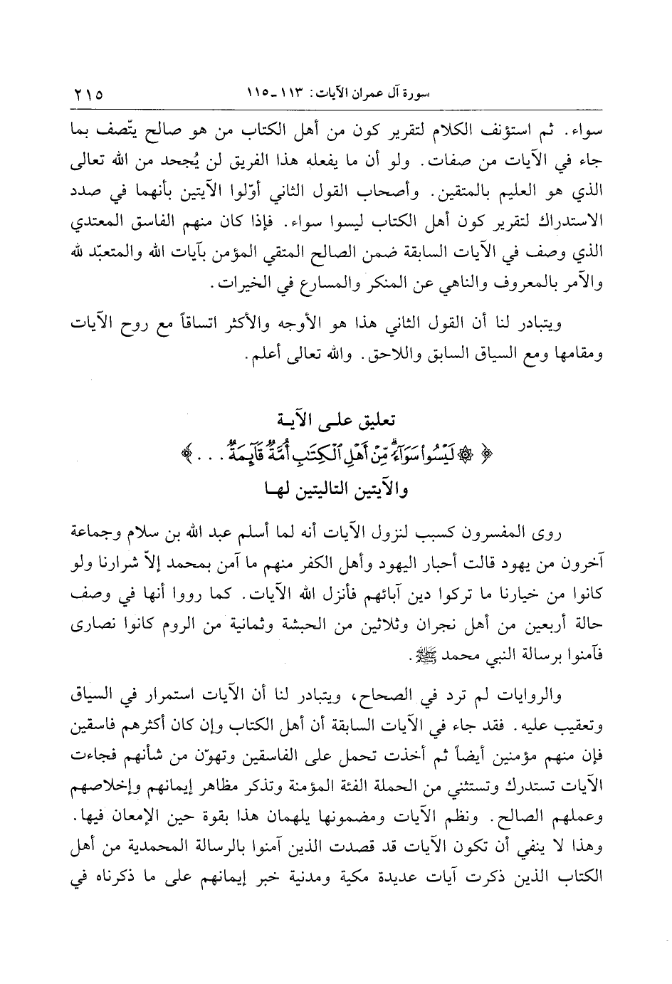 تعليق على الآية لَيْسُوا سَواءً مِنْ أَهْلِ الْكِتابِ أُمَّةٌ قائِمَةٌ ... والآيتين التاليتين لها