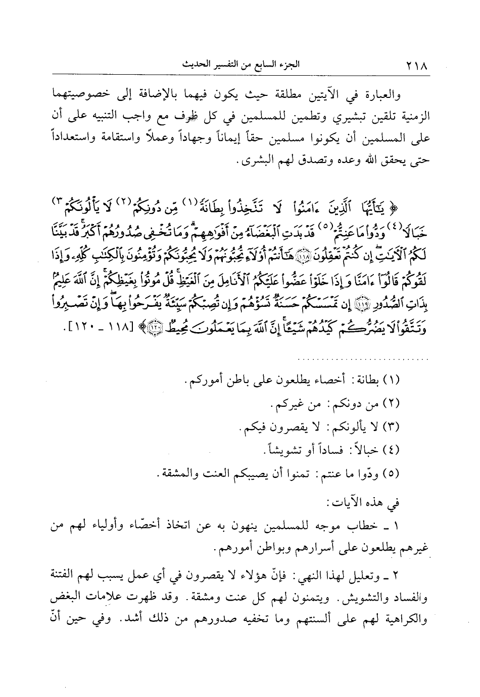 يا أَيُّهَا الَّذِينَ آمَنُوا لا تَتَّخِذُوا بِطانَةً مِنْ دُونِكُمْ لا يَأْلُونَكُمْ خَبالاً وَدُّوا ما عَنِتُّمْ قَدْ بَدَتِ الْبَغْضاءُ مِنْ أَفْواهِهِمْ وَما تُخْفِي صُدُورُهُمْ أَكْبَرُ قَدْ بَيَّنَّا لَكُمُ الْآياتِ إِنْ كُنْتُمْ تَعْقِلُونَ (118) ها أَنْتُمْ أُولاءِ تُحِبُّونَهُمْ وَلا يُحِبُّونَكُمْ وَتُؤْمِنُونَ بِالْكِتابِ كُلِّهِ وَإِذا لَقُوكُمْ قالُوا آمَنَّا وَإِذا خَلَوْا عَضُّوا عَلَيْكُمُ الْأَنامِلَ مِنَ الْغَيْظِ قُلْ مُوتُوا بِغَيْظِكُمْ إِنَّ اللَّهَ عَلِيمٌ بِذاتِ الصُّدُورِ (119) إِنْ تَمْسَسْكُمْ حَسَنَةٌ تَسُؤْهُمْ وَإِنْ تُصِبْكُمْ سَيِّئَةٌ يَفْرَحُوا بِها وَإِنْ تَصْبِرُوا وَتَتَّقُوا لا يَضُرُّكُمْ كَيْدُهُمْ شَيْئاً إِنَّ اللَّهَ بِما يَعْمَلُونَ مُحِيطٌ (120)
