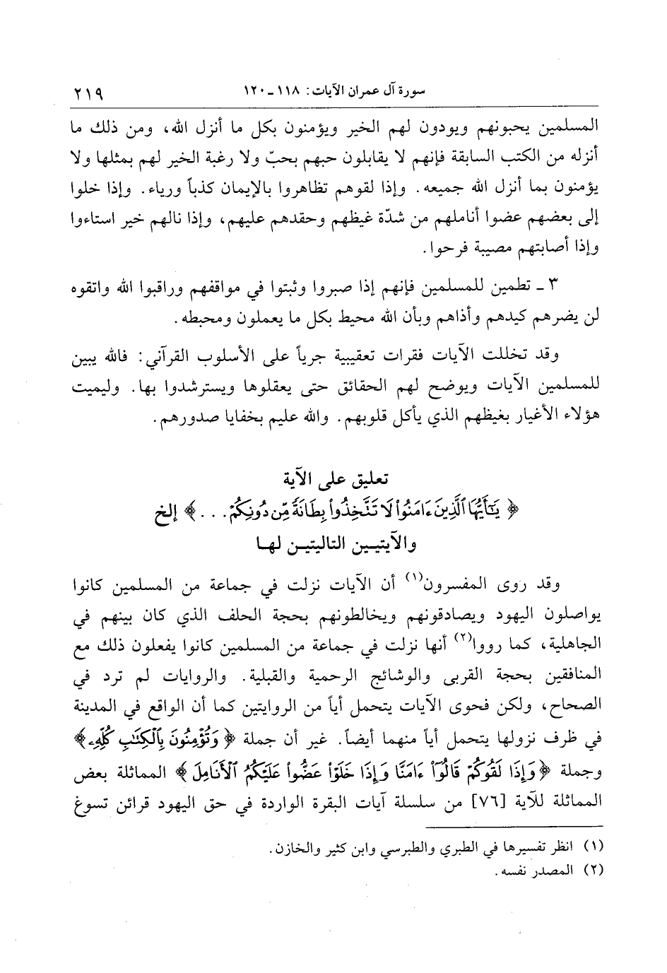 تعليق على الآية يا أَيُّهَا الَّذِينَ آمَنُوا لا تَتَّخِذُوا بِطانَةً مِنْ دُونِكُمْ ... إلخ والآيتين التاليتين لها