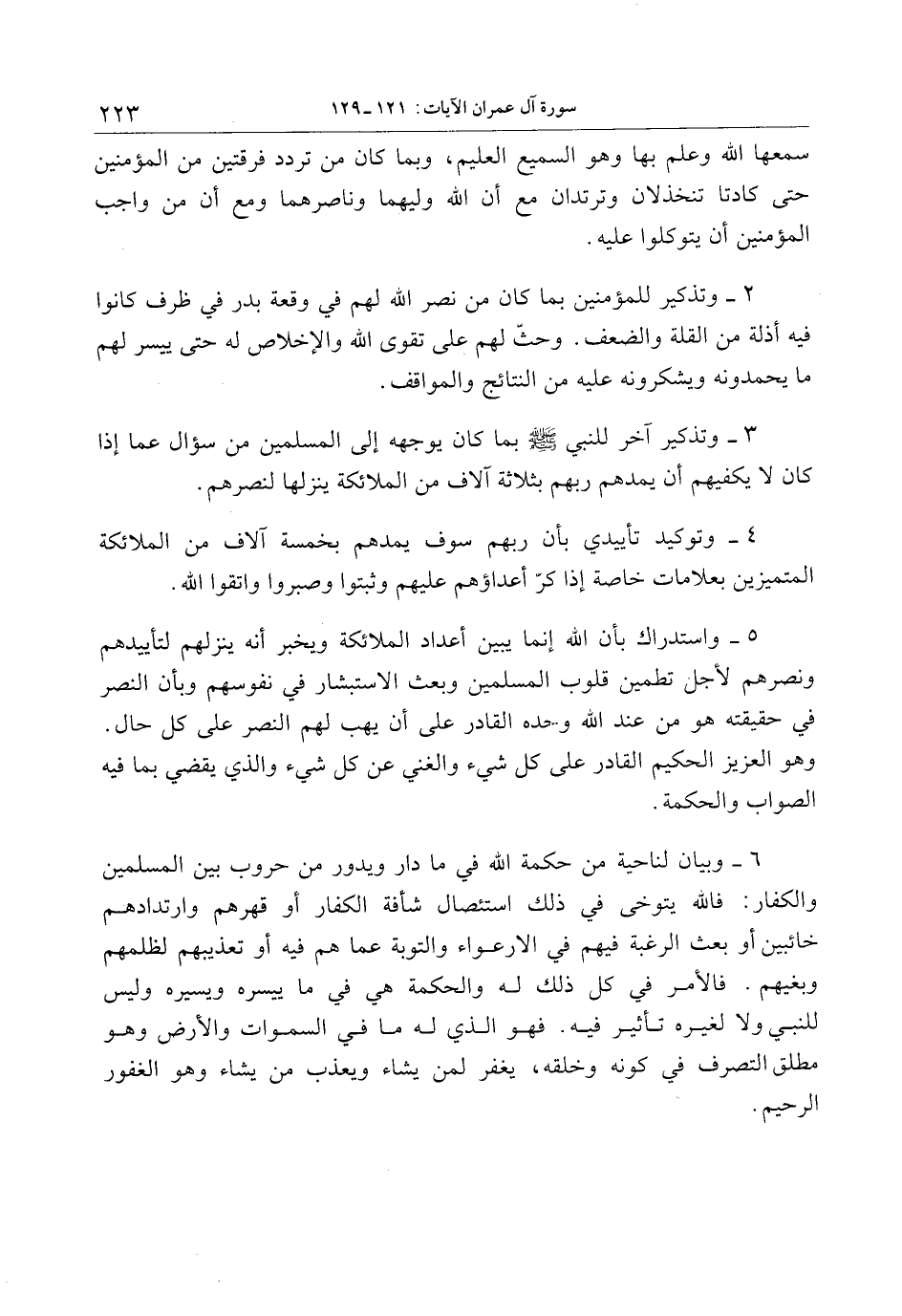 5- واستدراك بأن الله إنما يبين أعداد الملائكة ويخبر أنه ينزلهم لتأييدهم ونصرهم لأجل تطمين قلوب المسلمين وبعث الاستبشار في نفوسهم وبأن النصر في حقيقته هو من عند الله وحده القادر على أن يهب لهم النصر على كل حال.