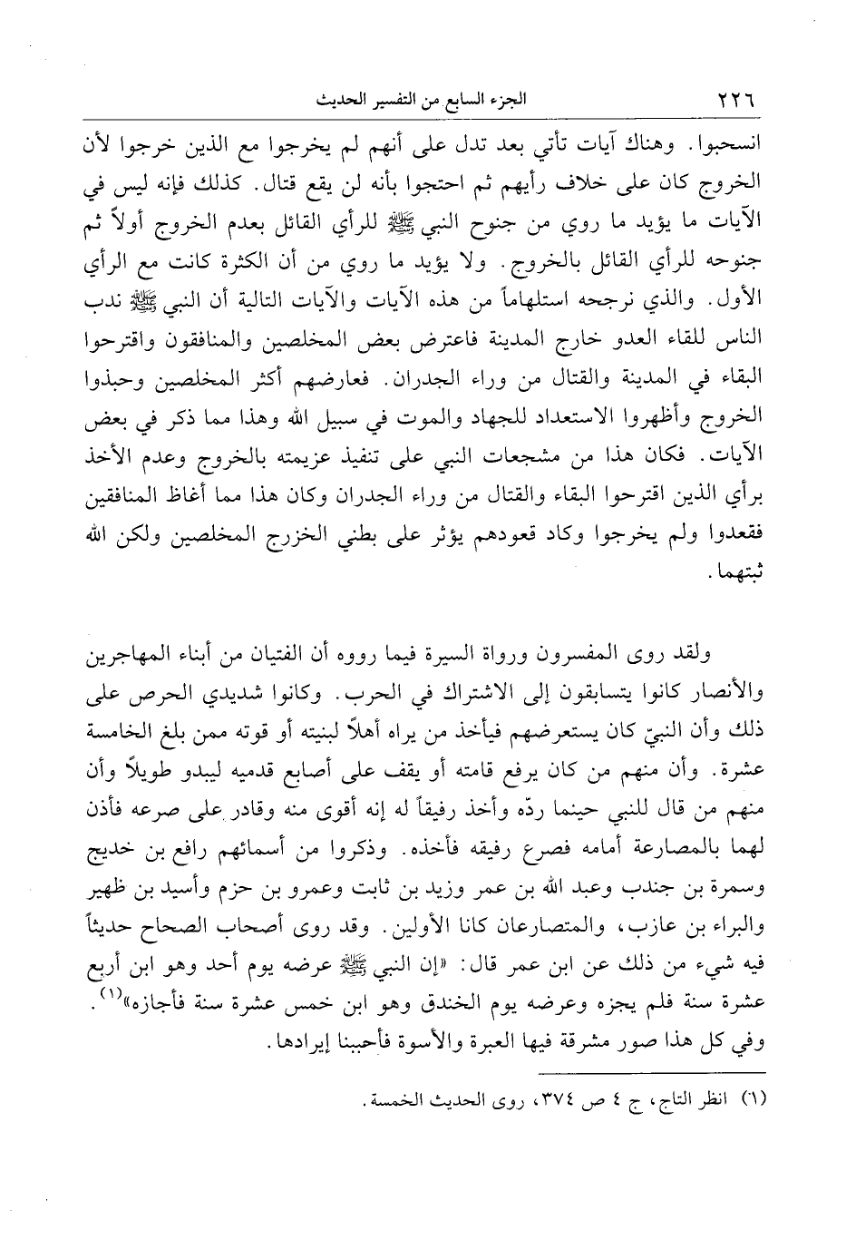 انسحبوا. وهناك آيات تأتي بعد تدل على أنهم لم يخرجوا مع الذين خرجوا لأن الخروج كان على خلاف رأيهم ثم احتجوا بأنه لن يقع قتال. كذلك فإنه ليس في الآيات ما يؤيد ما روي من جنوح النبي صلى الله عليه وسلم للرأي القائل بعدم الخروج أولا ثم جنوحه للرأي القائل بالخروج. ولا يؤيد ما روي من أن الكثرة كانت مع الرأي الأول. والذي نرجحه استلهاما من هذه الآيات والآيات التالية أن النبي صلى الله عليه وسلم ندب الناس للقاء العدو خارج المدينة فاعترض بعض المخلصين والمنافقون واقترحوا البقاء في المدينة والقتال من وراء الجدران. فعارضهم أكثر المخلصين وحبذوا الخروج وأظهروا الاستعداد للجهاد والموت في سبيل الله وهذا مما ذكر في بعض الآيات. فكان هذا من مشجعات النبي على تنفيذ عزيمته بالخروج وعدم الأخذ برأي الذين اقترحوا البقاء والقتال من وراء الجدران وكان هذا مما أغاظ المنافقين فقعدوا ولم يخرجوا وكاد قعودهم يؤثر على بطني الخزرج المخلصين ولكن الله ثبتهما.