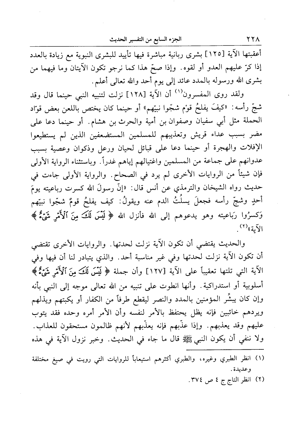 ولقد روى المفسرون «1» أن الآية [128] نزلت لتنبيه النبي حينما قال وقد شجّ رأسه: «كيف يفلح قوم شجّوا نبيّهم» أو حينما كان يختص باللعن بعض قوّاد الحملة مثل أبي سفيان وصفوان بن أمية والحرث بن هشام. أو حينما دعا على مضر بسبب عداء قريش وتعذيبهم للمسلمين المستضعفين الذين لم يستطيعوا الإفلات والهجرة أو حينما دعا على قبائل لحيان ورعل وذكوان وعصية بسبب عدوانهم على جماعة من المسلمين واغتيالهم إياهم غدرا. وباستثناء الرواية الأولى فإن شيئا من الروايات الأخرى لم يرد في الصحاح. والرواية الأولى جاءت في حديث رواه الشيخان والترمذي عن أنس قال: «إنّ رسول الله كسرت رباعيته يوم أحد وشجّ رأسه فجعل يسلت الدم عنه ويقول: كيف يفلح قوم شجّوا نبيّهم وكسروا رباعيته وهو يدعوهم إلى الله فأنزل الله لَيْسَ لَكَ مِنَ الْأَمْرِ شَيْءٌ الآية» «2» .