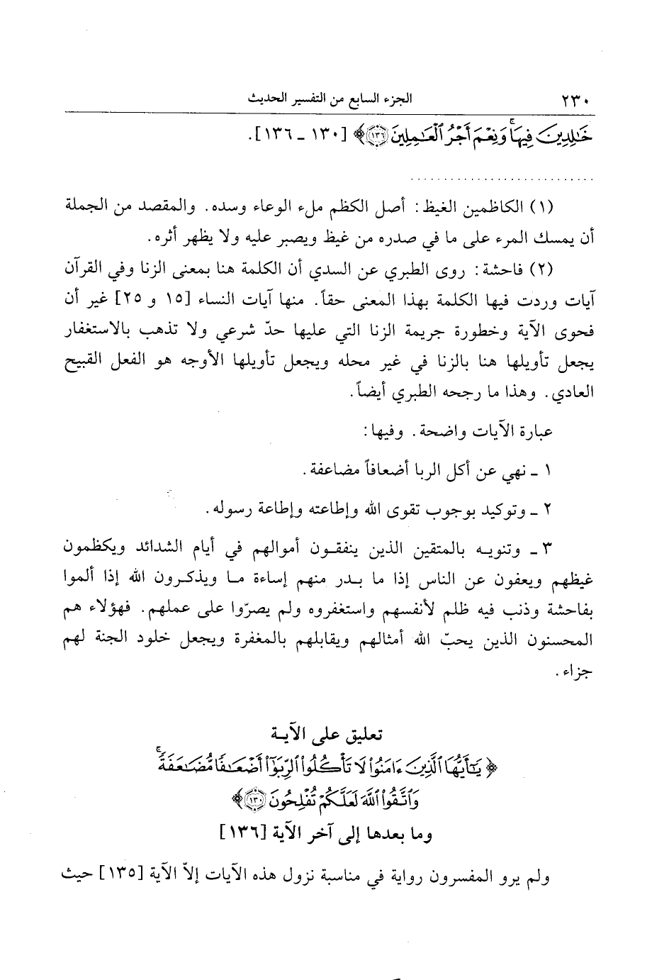 تعليق على الآية يا أَيُّهَا الَّذِينَ آمَنُوا لا تَأْكُلُوا الرِّبَوا أَضْعافاً مُضاعَفَةً وَاتَّقُوا اللَّهَ لَعَلَّكُمْ تُفْلِحُونَ (130) وما بعدها إلى آخر الآية [136]