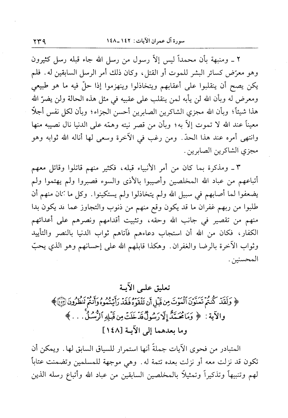 تعليق على الآية وَلَقَدْ كُنْتُمْ تَمَنَّوْنَ الْمَوْتَ مِنْ قَبْلِ أَنْ تَلْقَوْهُ فَقَدْ رَأَيْتُمُوهُ وَأَنْتُمْ تَنْظُرُونَ (143) والآية: وَما مُحَمَّدٌ إِلَّا رَسُولٌ قَدْ خَلَتْ مِنْ قَبْلِهِ الرُّسُلُ ... وما بعدهما إلى الآية [148]