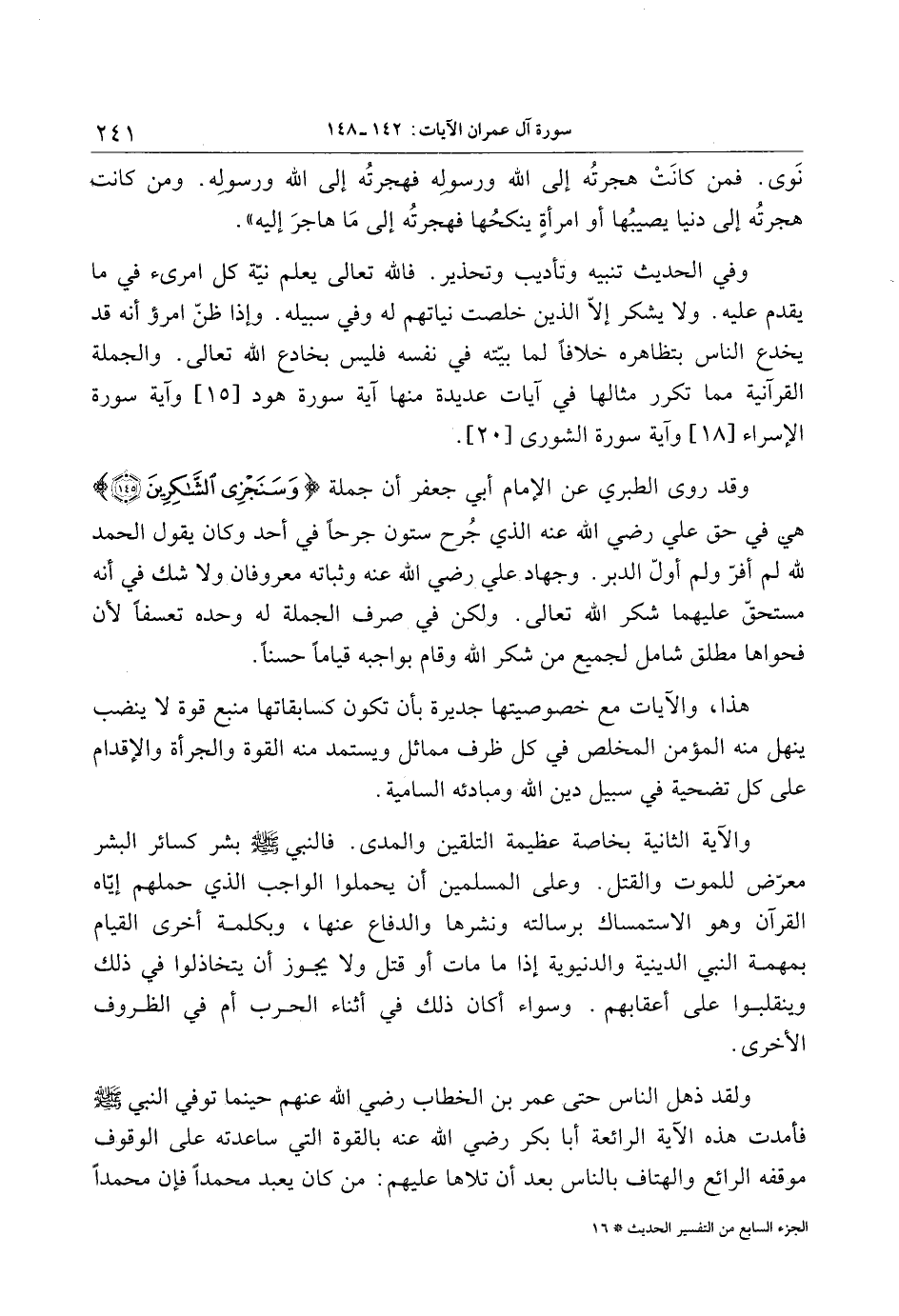 وقد روى الطبري عن الإمام أبي جعفر أن جملة وَسَنَجْزِي الشَّاكِرِينَ (145) هي في حق علي رضي الله عنه الذي جرح ستون جرحا في أحد وكان يقول الحمد لله لم أفرّ ولم أولّ الدبر. وجهاد علي رضي الله عنه وثباته معروفان ولا شك في أنه مستحقّ عليهما شكر الله تعالى. ولكن في صرف الجملة له وحده تعسفا لأن فحواها مطلق شامل لجميع من شكر الله وقام بواجبه قياما حسنا.