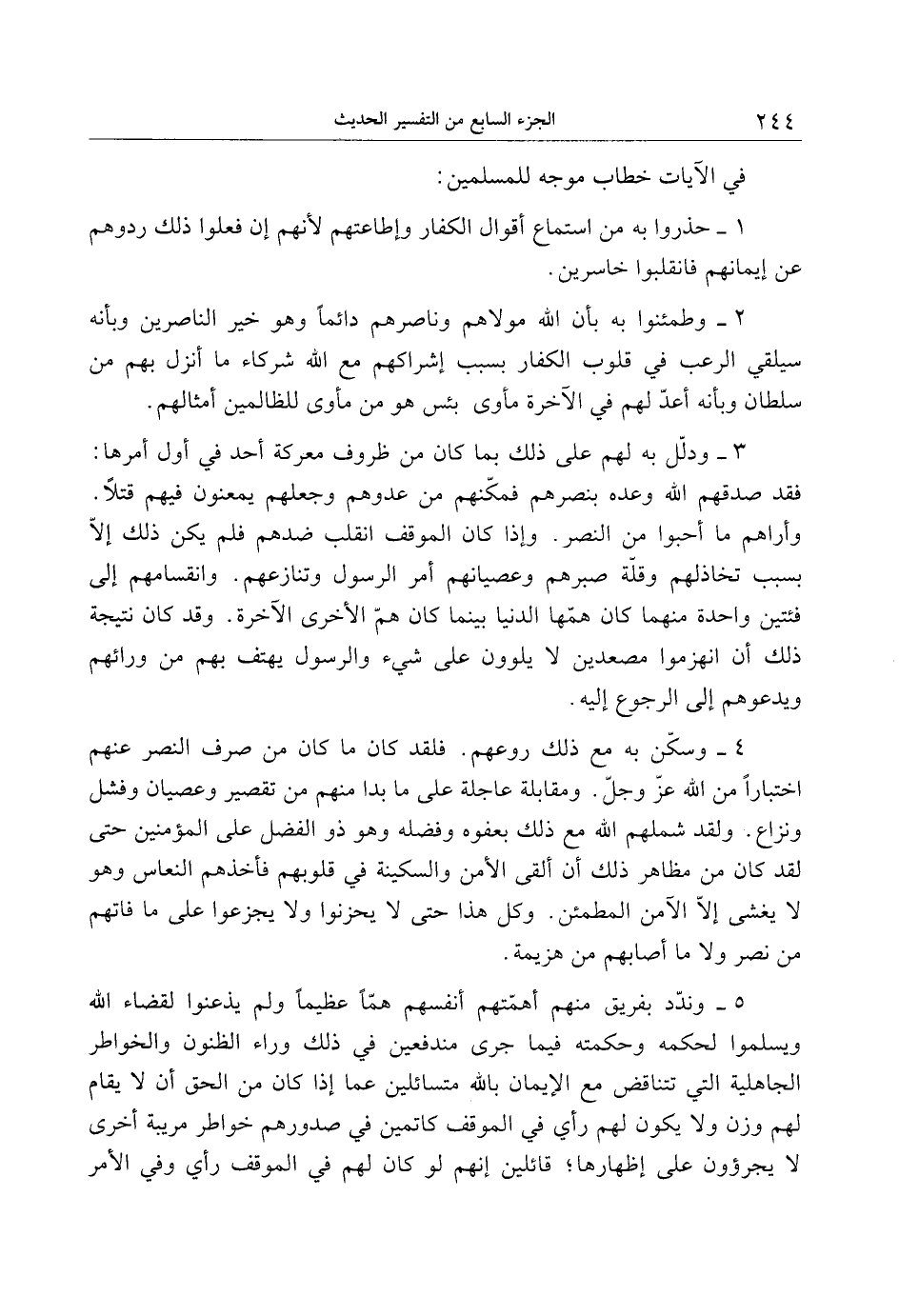 4- وسكّن به مع ذلك روعهم. فلقد كان ما كان من صرف النصر عنهم اختبارا من الله عزّ وجلّ. ومقابلة عاجلة على ما بدا منهم من تقصير وعصيان وفشل ونزاع. ولقد شملهم الله مع ذلك بعفوه وفضله وهو ذو الفضل على المؤمنين حتى لقد كان من مظاهر ذلك أن ألقى الأمن والسكينة في قلوبهم فأخذهم النعاس وهو لا يغشى إلّا الآمن المطمئن. وكل هذا حتى لا يحزنوا ولا يجزعوا على ما فاتهم من نصر ولا ما أصابهم من هزيمة.