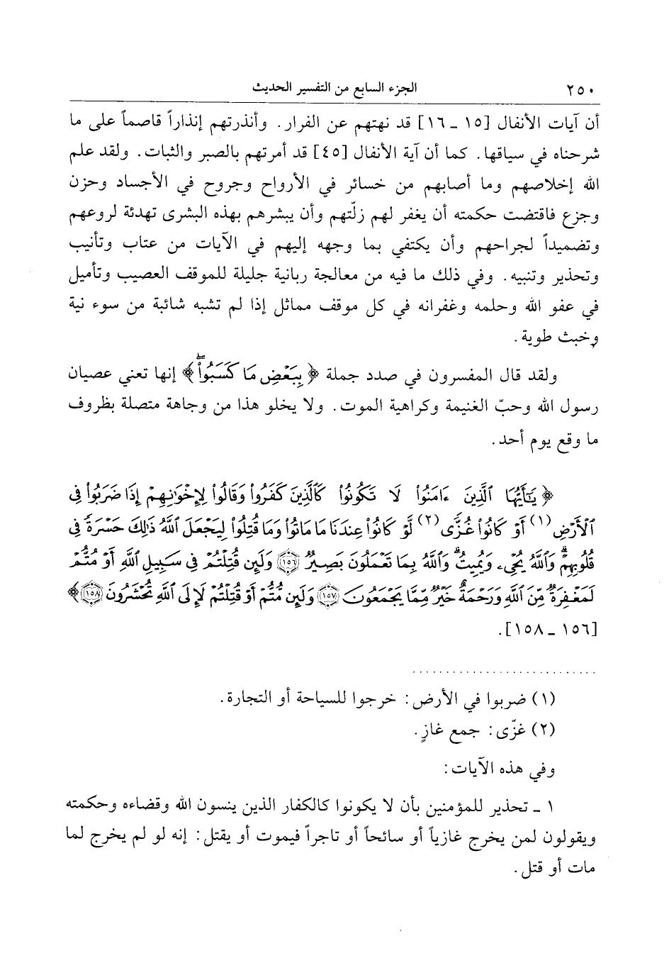 يا أَيُّهَا الَّذِينَ آمَنُوا لا تَكُونُوا كَالَّذِينَ كَفَرُوا وَقالُوا لِإِخْوانِهِمْ إِذا ضَرَبُوا فِي الْأَرْضِ أَوْ كانُوا غُزًّى لَوْ كانُوا عِنْدَنا ما ماتُوا وَما قُتِلُوا لِيَجْعَلَ اللَّهُ ذلِكَ حَسْرَةً فِي قُلُوبِهِمْ وَاللَّهُ يُحْيِي وَيُمِيتُ وَاللَّهُ بِما تَعْمَلُونَ بَصِيرٌ (156) وَلَئِنْ قُتِلْتُمْ فِي سَبِيلِ اللَّهِ أَوْ مُتُّمْ لَمَغْفِرَةٌ مِنَ اللَّهِ وَرَحْمَةٌ خَيْرٌ مِمَّا يَجْمَعُونَ (157) وَلَئِنْ مُتُّمْ أَوْ قُتِلْتُمْ لَإِلَى اللَّهِ تُحْشَرُونَ (158)