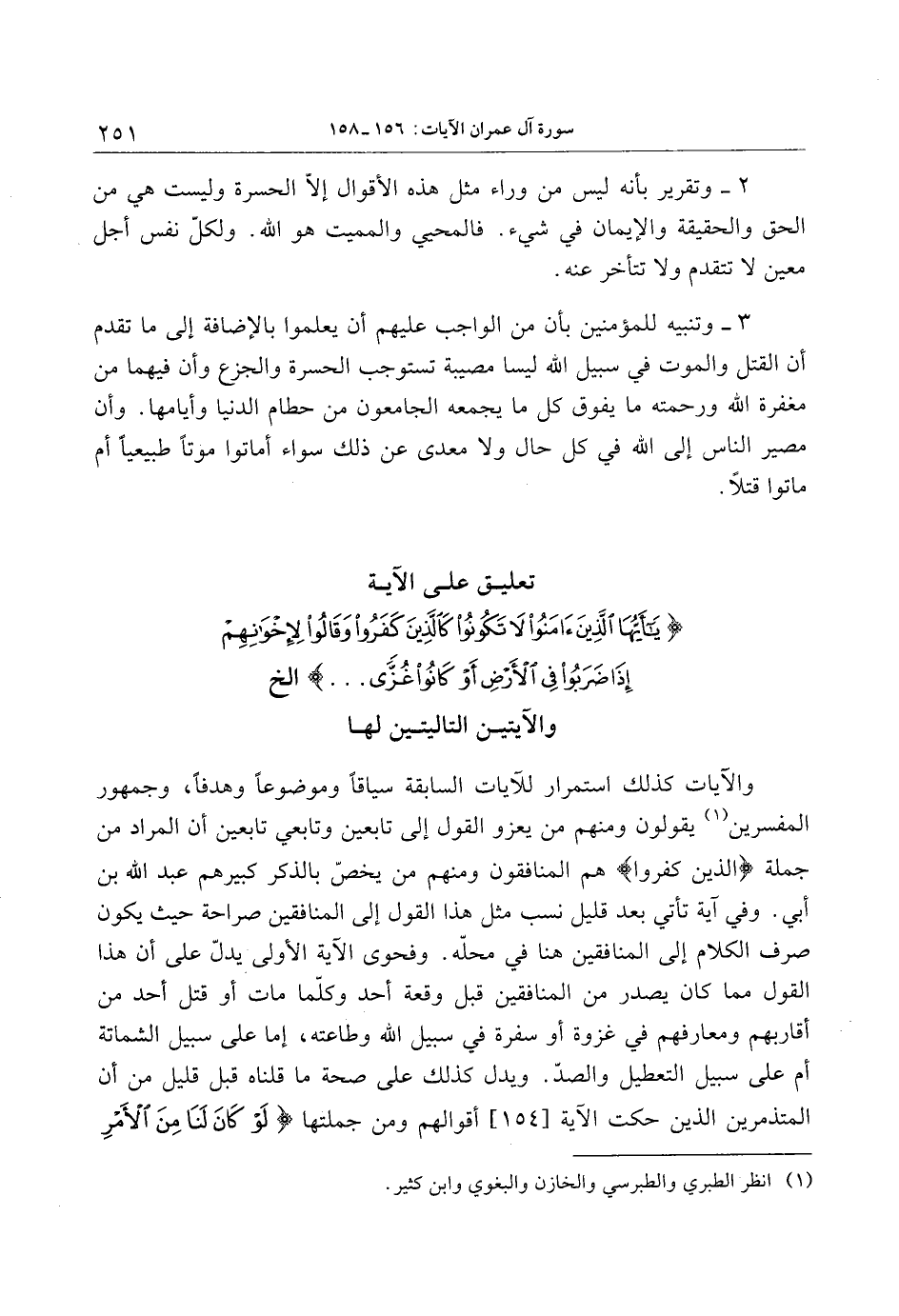 تعليق على الآية يا أَيُّهَا الَّذِينَ آمَنُوا لا تَكُونُوا كَالَّذِينَ كَفَرُوا وَقالُوا لِإِخْوانِهِمْ إِذا ضَرَبُوا فِي الْأَرْضِ أَوْ كانُوا غُزًّى ... إلخ والآيتين التاليتين لها