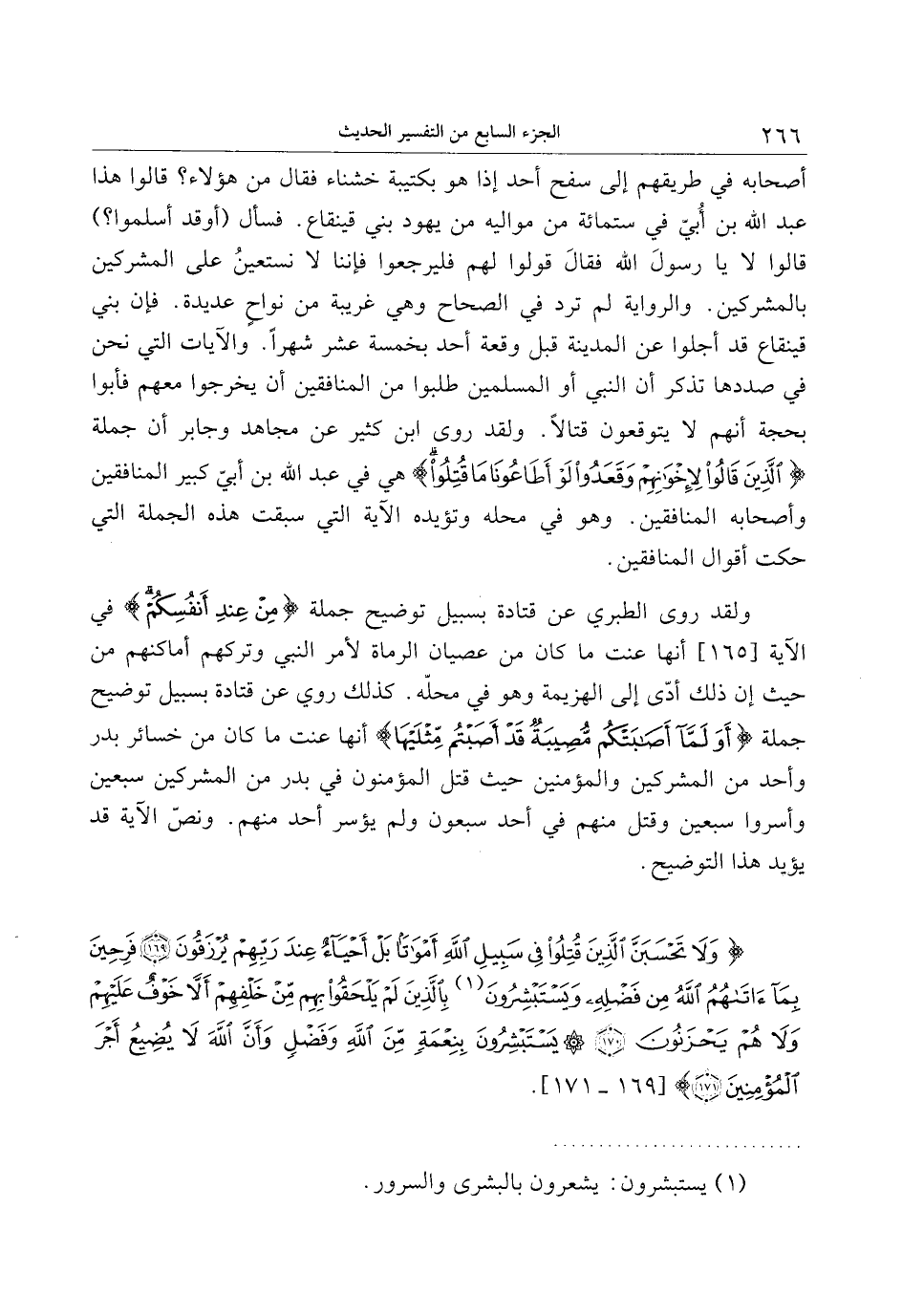أصحابه في طريقهم إلى سفح أحد إذا هو بكتيبة خشناء فقال من هؤلاء؟ قالوا هذا عبد الله بن أبيّ في ستمائة من مواليه من يهود بني قينقاع. فسأل (أو قد أسلموا؟) قالوا لا يا رسول الله فقال قولوا لهم فليرجعوا فإننا لا نستعين على المشركين بالمشركين. والرواية لم تردد في الصحاح وهي غريبة من نواح عديدة. فإن بني قينقاع قد أجلوا عن المدينة قبل وقعة أحد بخمسة عشر شهرا. والآيات التي نحن في صددها تذكر أن النبي أو المسلمين طلبوا من المنافقين أن يخرجوا معهم فأبوا بحجة أنهم لا يتوقعون قتالا. ولقد روى ابن كثير عن مجاهد وجابر أن جملة الَّذِينَ قالُوا لِإِخْوانِهِمْ وَقَعَدُوا لَوْ أَطاعُونا ما قُتِلُوا هي في عبد الله بن أبيّ كبير المنافقين وأصحابه المنافقين. وهو في محله وتؤيده الآية التي سبقت هذه الجملة التي حكت أقوال المنافقين.