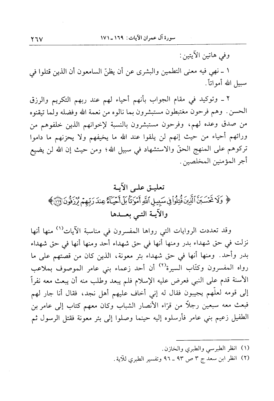 تعليق على الآية وَلا تَحْسَبَنَّ الَّذِينَ قُتِلُوا فِي سَبِيلِ اللَّهِ أَمْواتاً بَلْ أَحْياءٌ عِنْدَ رَبِّهِمْ يُرْزَقُونَ (169) والآية التي بعدها