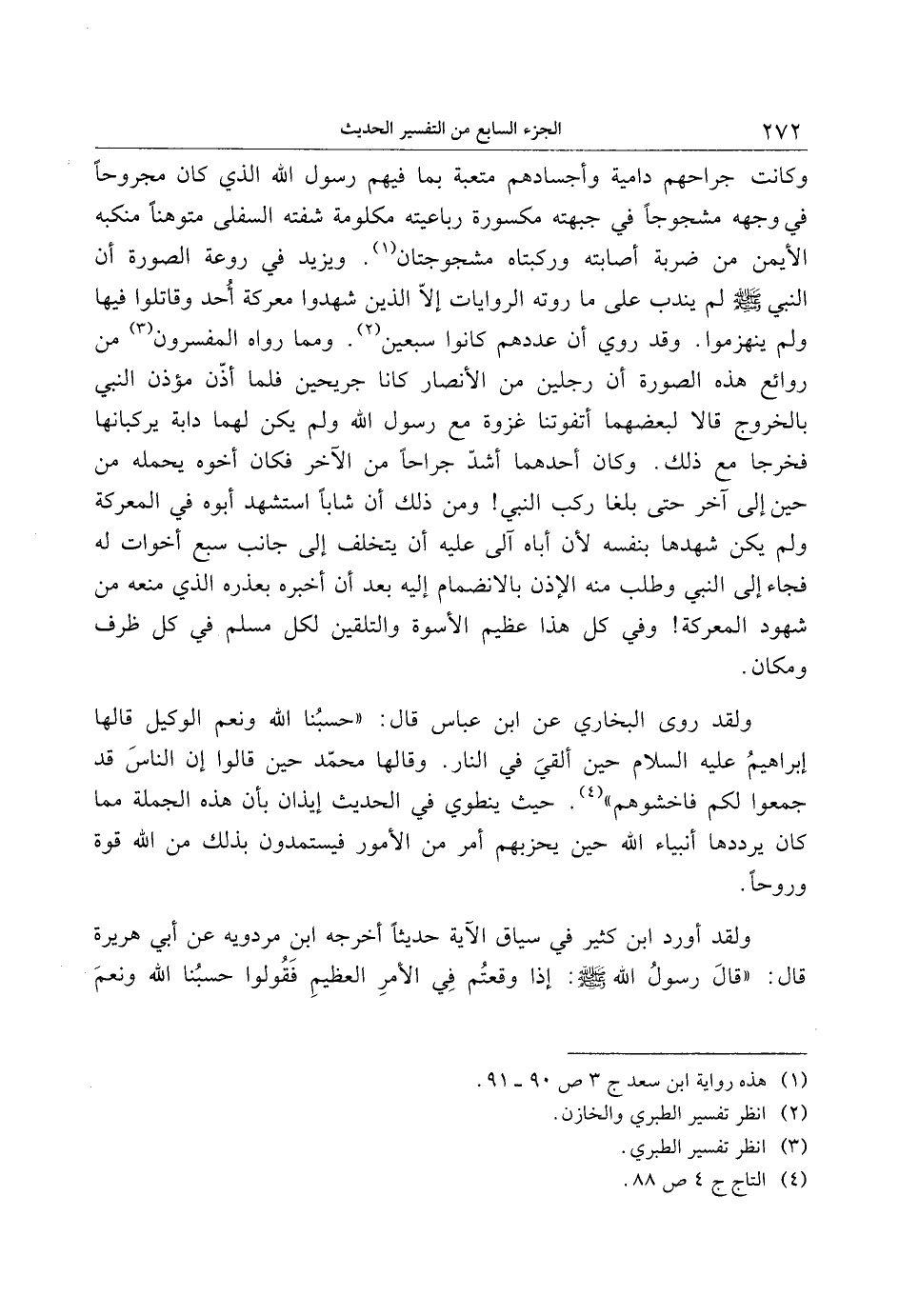 وكانت جراحهم دامية وأجسادهم متعبة بما فيهم رسول الله الذي كان مجروحا في وجهه مشجوجا في جبهته مكسورة رباعيته مكلومة شفته السفلى متوهنا منكبه الأيمن من ضربة أصابته وركبتاه مشجوجتان «1» . ويزيد في روعة الصورة أن النبي صلى الله عليه وسلم لم يندب على ما روته الروايات إلّا الذين شهدوا معركة أحد وقاتلوا فيها ولم ينهزموا. وقد روي أن عددهم كانوا سبعين «2» . ومما رواه المفسرون «3» من روائع هذه الصورة أن رجلين من الأنصار كانا جريحين فلما أذّن مؤذن النبي بالخروج قالا لبعضهما أتفوتنا غزوة مع رسول الله ولم يكن لهما دابة يركبانها فخرجا مع ذلك. وكان أحدهما أشدّ جراحا من الآخر فكان أخوه يحمله من حين إلى آخر حتى بلغا ركب النبي! ومن ذلك أن شابا استشهد أبوه في المعركة ولم يكن شهدها بنفسه لأن أباه آلى عليه أن يتخلف إلى جانب سبع أخوات له فجاء إلى النبي وطلب منه الإذن بالانضمام إليه بعد أن أخبره بعذره الذي منعه من شهود المعركة! وفي كل هذا عظيم الأسوة والتلقين لكل مسلم في كل ظرف ومكان.