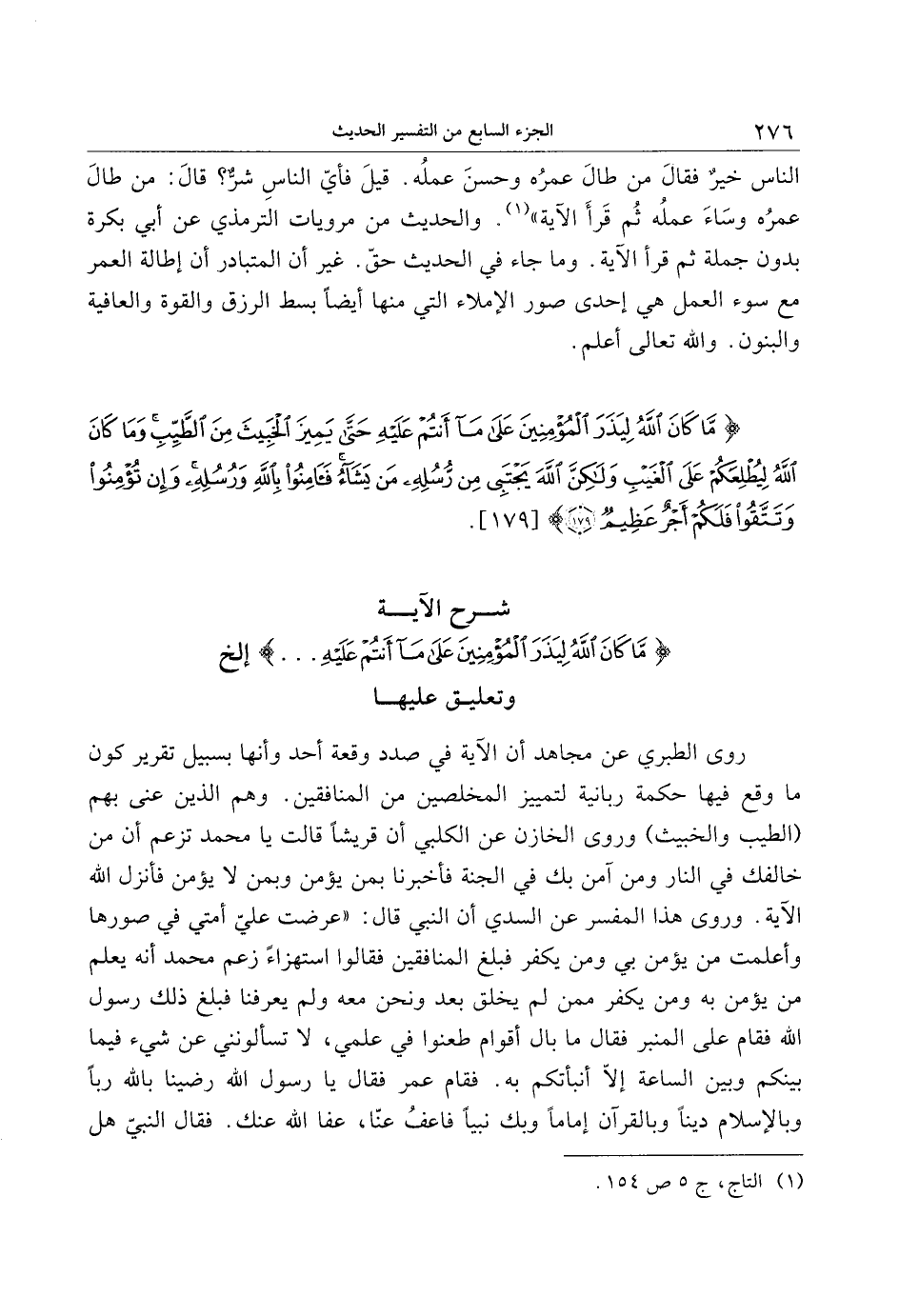 . شرح الآية ما كانَ اللَّهُ لِيَذَرَ الْمُؤْمِنِينَ عَلى ما أَنْتُمْ عَلَيْهِ ... إلخ وتعليق عليها