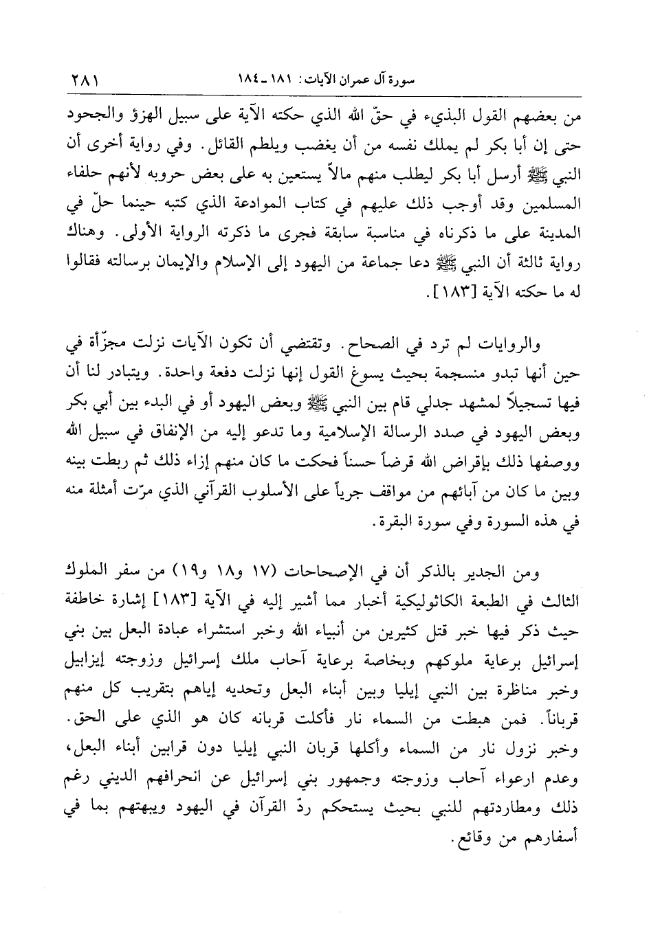 ومن الجدير بالذكر أن في الإصحاحات (17 و 18 و 19) من سفر الملوك الثالث في الطبعة الكاثوليكية أخبار مما أشير إليه في الآية [183] إشارة خاطفة حيث ذكر فيها خبر قتل كثيرين من أنبياء الله وخبر استشراء عبادة البعل بين بني إسرائيل برعاية ملوكهم وبخاصة برعاية آحاب ملك إسرائيل وزوجته إيزابيل وخبر مناظرة بين النبي إيليا وبين أبناء البعل وتحديه إياهم بتقريب كل منهم قربانا. فمن هبطت من السماء نار فأكلت قربانه كان هو الذي على الحق.