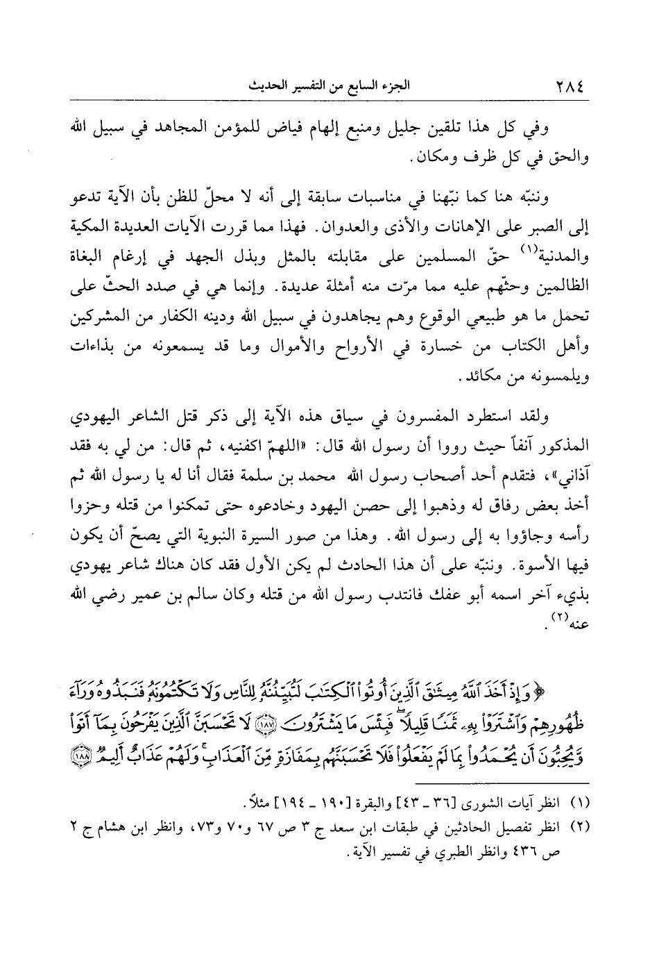 ولقد استطرد المفسرون في سياق هذه الآية إلى ذكر قتل الشاعر اليهودي المذكور آنفا حيث رووا أن رسول الله قال: «اللهمّ اكفنيه، ثم قال: من لي به فقد آذاني» ، فتقدم أحد أصحاب رسول الله محمد بن سلمة فقال أنا له يا رسول الله ثم أخذ بعض رفاق له وذهبوا إلى حصن اليهود وخادعوه حتى تمكنوا من قتله وحزوا رأسه وجاؤوا به إلى رسول الله. وهذا من صور السيرة النبوية التي يصحّ أن يكون فيها الأسوة. وننبّه على أن هذا الحادث لم يكن الأول فقد كان هناك شاعر يهودي بذيء آخر اسمه أبو عفك فانتدب رسول الله من قتله وكان سالم بن عمير رضي الله عنه «2» .