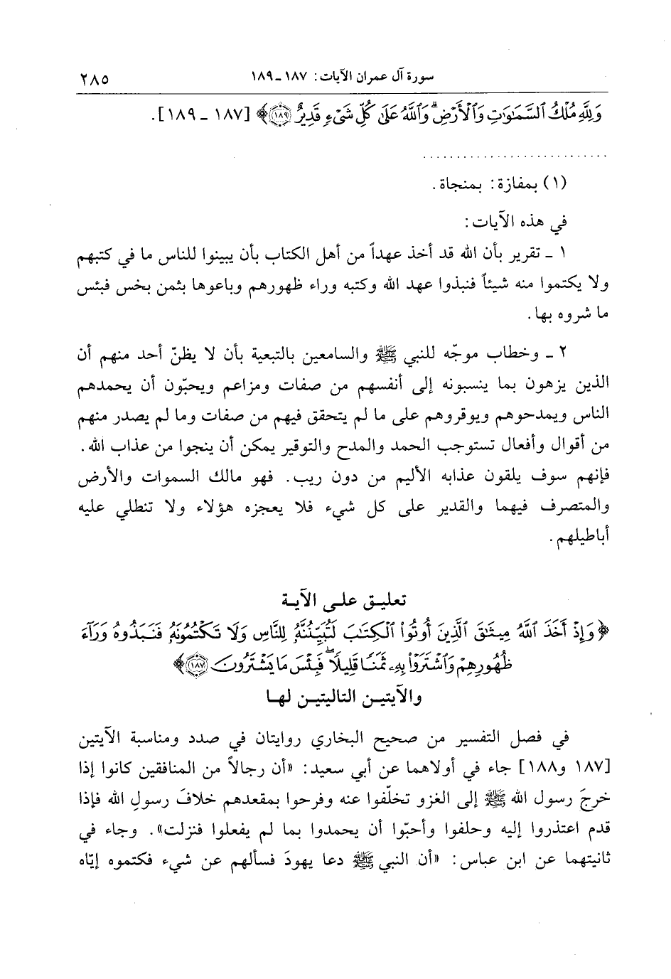 تعليق على الآية وَإِذْ أَخَذَ اللَّهُ مِيثاقَ الَّذِينَ أُوتُوا الْكِتابَ لَتُبَيِّنُنَّهُ لِلنَّاسِ وَلا تَكْتُمُونَهُ فَنَبَذُوهُ وَراءَ ظُهُورِهِمْ وَاشْتَرَوْا بِهِ ثَمَناً قَلِيلًا فَبِئْسَ ما يَشْتَرُونَ (187) والآيتين التاليتين لها