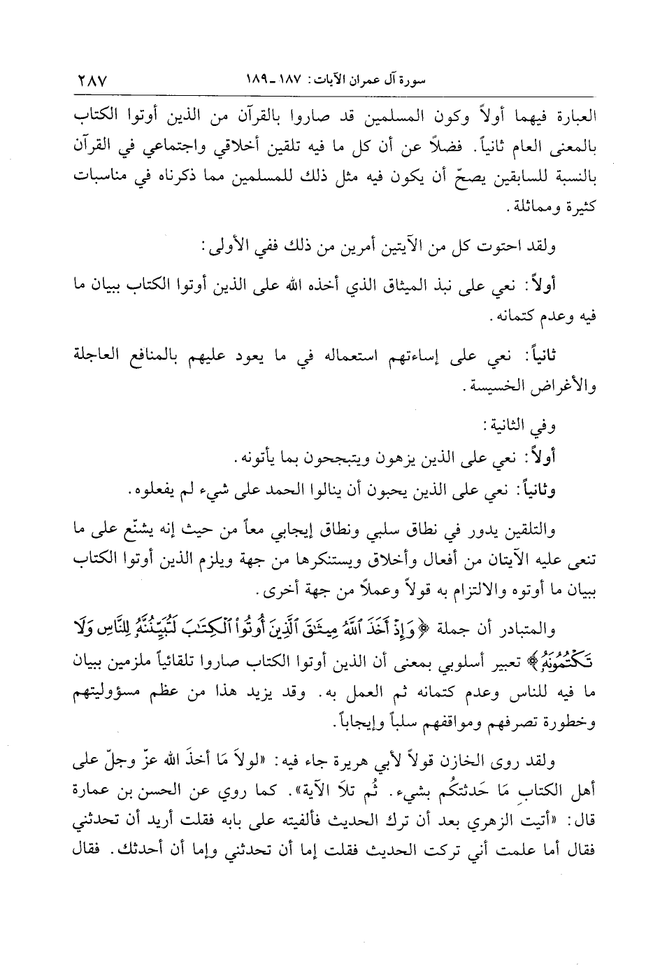 والمتبادر أن جملة وَإِذْ أَخَذَ اللَّهُ مِيثاقَ الَّذِينَ أُوتُوا الْكِتابَ لَتُبَيِّنُنَّهُ لِلنَّاسِ وَلا تَكْتُمُونَهُ تعبير أسلوبي بمعنى أن الذين أوتوا الكتاب صاروا تلقائيا ملزمين ببيان ما فيه للناس وعدم كتمانه ثم العمل به. وقد يزيد هذا من عظم مسؤوليتهم وخطورة تصرفهم ومواقفهم سلبا وإيجابا.