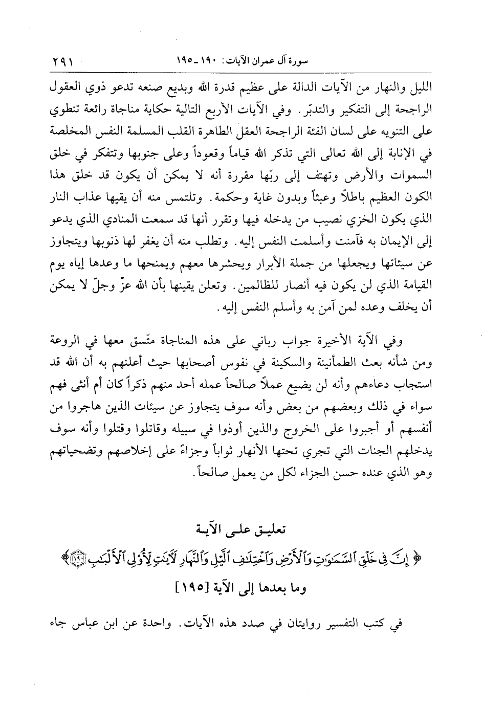 تعليق على الآية إِنَّ فِي خَلْقِ السَّماواتِ وَالْأَرْضِ وَاخْتِلافِ اللَّيْلِ وَالنَّهارِ لَآياتٍ لِأُولِي الْأَلْبابِ (190) وما بعدها إلى الآية [195]