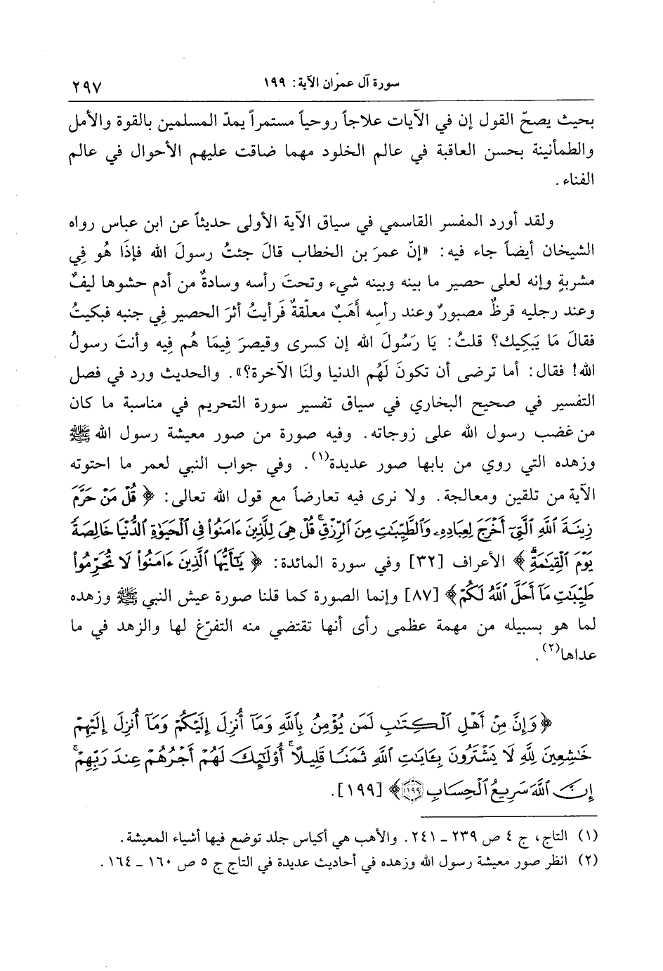 ولقد أورد المفسر القاسمي في سياق الآية الأولى حديثا عن ابن عباس رواه الشيخان أيضا جاء فيه: «إنّ عمر بن الخطاب قال جئت رسول الله فإذا هو في مشربة وإنه لعلى حصير ما بينه وبينه شيء وتحت رأسه وسادة من أدم حشوها ليف وعند رجليه قرظ مصبور وعند رأسه أهب معلّقة فرأيت أثر الحصير في جنبه فبكيت فقال ما يبكيك؟ قلت: يا رسول الله إن كسرى وقيصر فيما هم فيه وأنت رسول الله! فقال: أما ترضى أن تكون لهم الدنيا ولنا الآخرة؟» . والحديث ورد في فصل التفسير في صحيح البخاري في سياق تفسير سورة التحريم في مناسبة ما كان من غضب رسول الله على زوجاته. وفيه صورة من صور معيشة رسول الله صلى الله عليه وسلم وزهده التي روي من بابها صور عديدة «1» . وفي جواب النبي لعمر ما احتوته الآية من تلقين ومعالجة. ولا نرى فيه تعارضا مع قول الله تعالى: قُلْ مَنْ حَرَّمَ زِينَةَ اللَّهِ الَّتِي أَخْرَجَ لِعِبادِهِ وَالطَّيِّباتِ مِنَ الرِّزْقِ قُلْ هِيَ لِلَّذِينَ آمَنُوا فِي الْحَياةِ الدُّنْيا خالِصَةً يَوْمَ الْقِيامَةِ