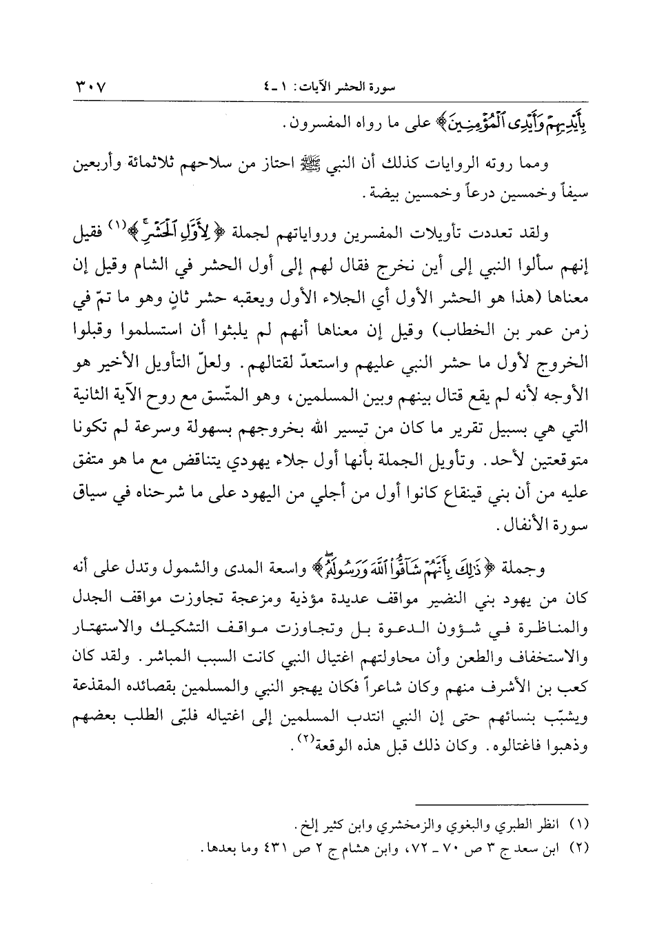 ولقد تعددت تأويلات المفسرين ورواياتهم لجملة لِأَوَّلِ الْحَشْرِ «1» فقيل إنهم سألوا النبي إلى أين نخرج فقال لهم إلى أول الحشر في الشام وقيل إن معناها (هذا هو الحشر الأول أي الجلاء الأول ويعقبه حشر ثان وهو ما تمّ في زمن عمر بن الخطاب) وقيل إن معناها أنهم لم يلبثوا أن استسلموا وقبلوا الخروج لأول ما حشر النبي عليهم واستعدّ لقتالهم. ولعلّ التأويل الأخير هو الأوجه لأنه لم يقع قتال بينهم وبين المسلمين، وهو المتّسق مع روحه الآية الثانية التي هي بسبيل تقرير ما كان من تيسير الله بخروجهم بسهولة وسرعة لم تكونا متوقعتين لأحد. وتأويل الجملة بأنها أول جلاء يهودي يتناقض مع ما هو متفق عليه من أن بني قينقاع كانوا أول من أجلي من اليهود على ما شرحناه في سياق سورة الأنفال.