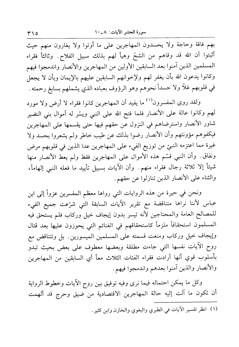 وكل ما يمكن احتماله فيما نرى وفيه توفيق بين روح الآيات وخطوط الرواية أن تكون ما آلت إليه حالة المهاجرين الاقتصادية من ضيق وحرج قد ألهمت