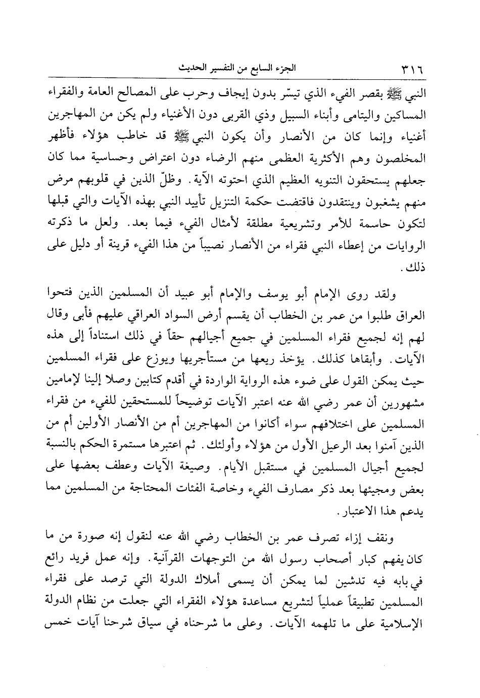 ونقف إزاء تصرف عمر بن الخطاب رضي الله عنه لنقول إنه صورة من ما كان يفهم كبار أصحاب رسول الله من التوجهات القرآنية. وإنه عمل فريد رائع في بابه فيه تدشين لما يمكن أن يسمى أملاك الدولة التي ترصد على فقراء المسلمين تطبيقا عمليا لتشريع مساعدة هؤلاء الفقراء التي جعلت من نظام الدولة الإسلامية على ما تلهمه الآيات. وعلى ما شرحناه في سياق شرحنا آيات خمس