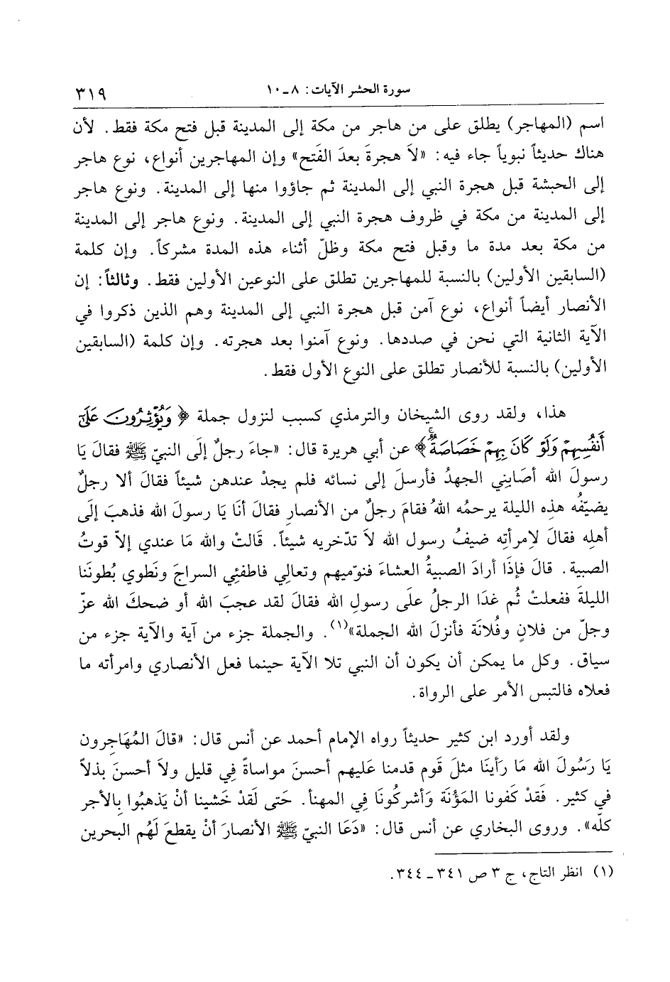 هذا، ولقد روى الشيخان والترمذي كسبب لنزول جملة وَيُؤْثِرُونَ عَلى أَنْفُسِهِمْ وَلَوْ كانَ بِهِمْ خَصاصَةٌ عن أبي هريرة قال: «جاء رجل إلى النبيّ صلى الله عليه وسلم فقال يا رسول الله أصابني الجهد فأرسل إلى نسائه فلم يجد عندهن شيئا فقال ألا رجل يضيّفه هذه الليلة يرحمه الله فقام رجل من الأنصار فقال أنا يا رسول الله فذهب إلى أهله فقال لامرأته ضيف رسول الله لا تدّخريه شيئا. قالت والله ما عندي إلّا قوت الصبية. قال فإذا أراد الصبية العشاء فنوّميهم وتعالي فاطفئي السراج ونطوي بطوننا الليلة ففعلت ثم غدا الرجل على رسول الله فقال لقد عجب الله أو ضحك الله عزّ وجلّ من فلان وفلانة فأنزل الله الجملة» «1» . والجملة جزء من آية والآية جزء من سياق. وكل ما يمكن أن يكون أن النبي تلا الآية حينما فعل الأنصاري وامرأته ما فعلاه فالتبس الأمر على الرواة.