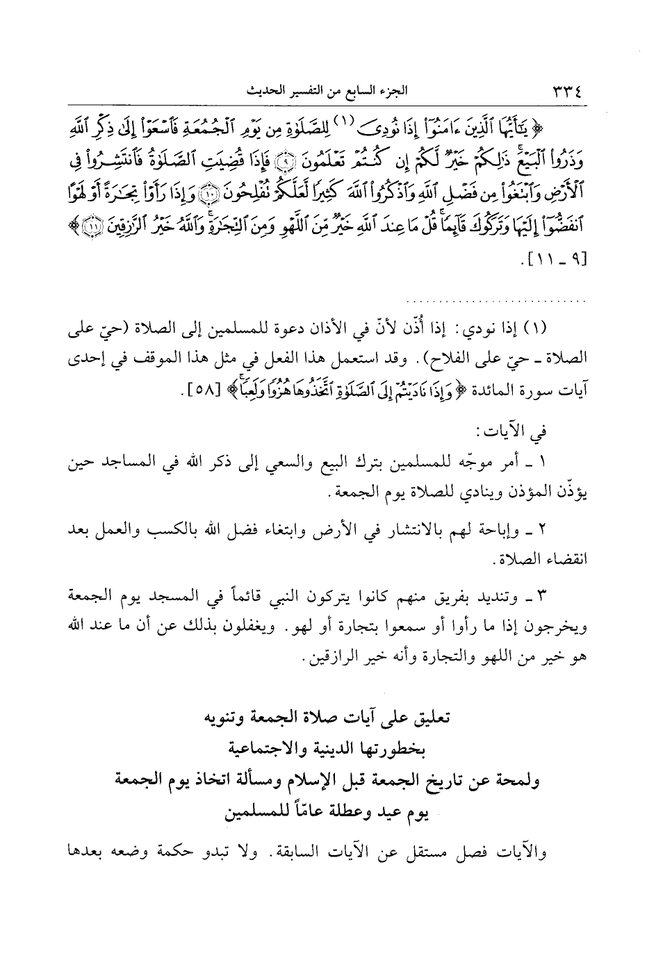 تعليق على آيات صلاة الجمعة وتنويه بخطورتها الدينية والاجتماعية ولمحة عن تاريخ الجمعة قبل الإسلام ومسألة اتخاذ يوم الجمعة يوم عيد وعطلة عامّا للمسلمين