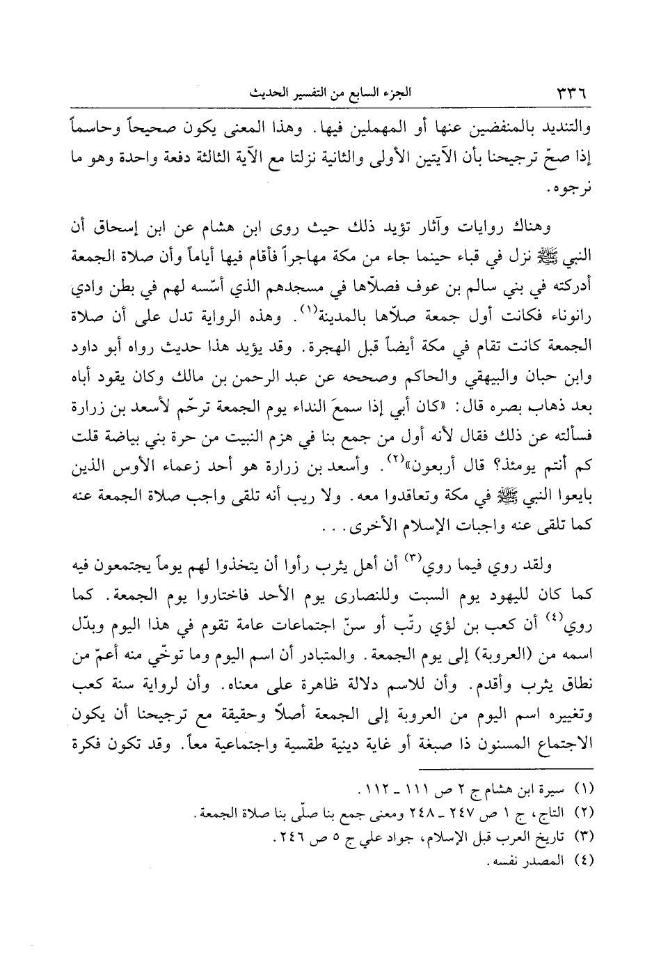والتنديد بالمنفضين عنها أو المهملين فيها. وهذا المعنى يكون صحيحا وحاسما إذا صحّ ترجيحنا بأن الآيتين الأولى والثانية نزلتا مع الآية الثالثة دفعة واحدة وهو ما نرجوه.