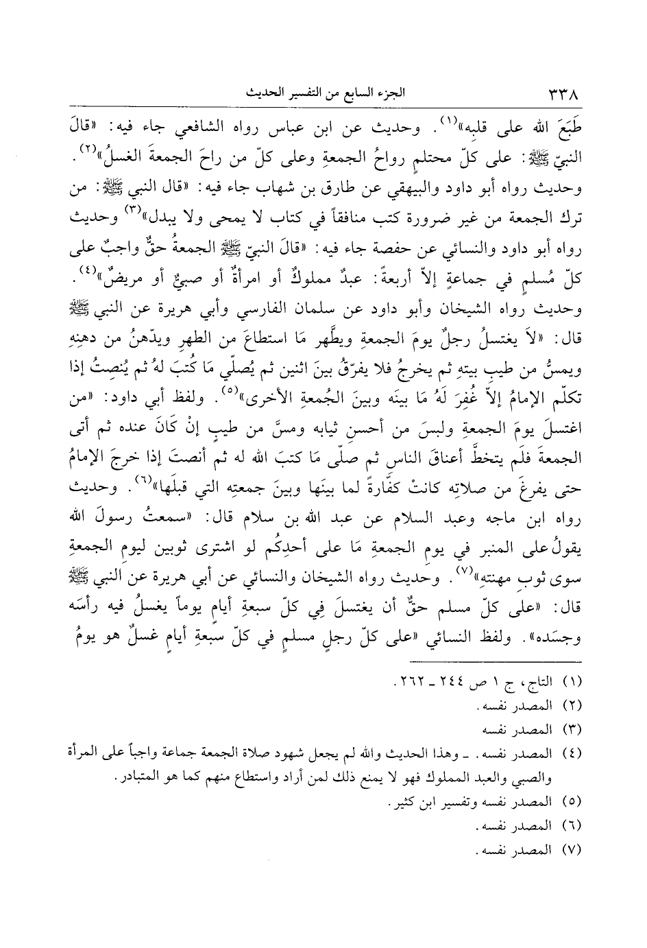 طبع الله على قلبه» «1» . وحديث عن ابن عباس رواه الشافعي جاء فيه: «قال النبيّ صلى الله عليه وسلم: على كلّ محتلم رواح الجمعة وعلى كلّ من راح الجمعة الغسل» «2» .