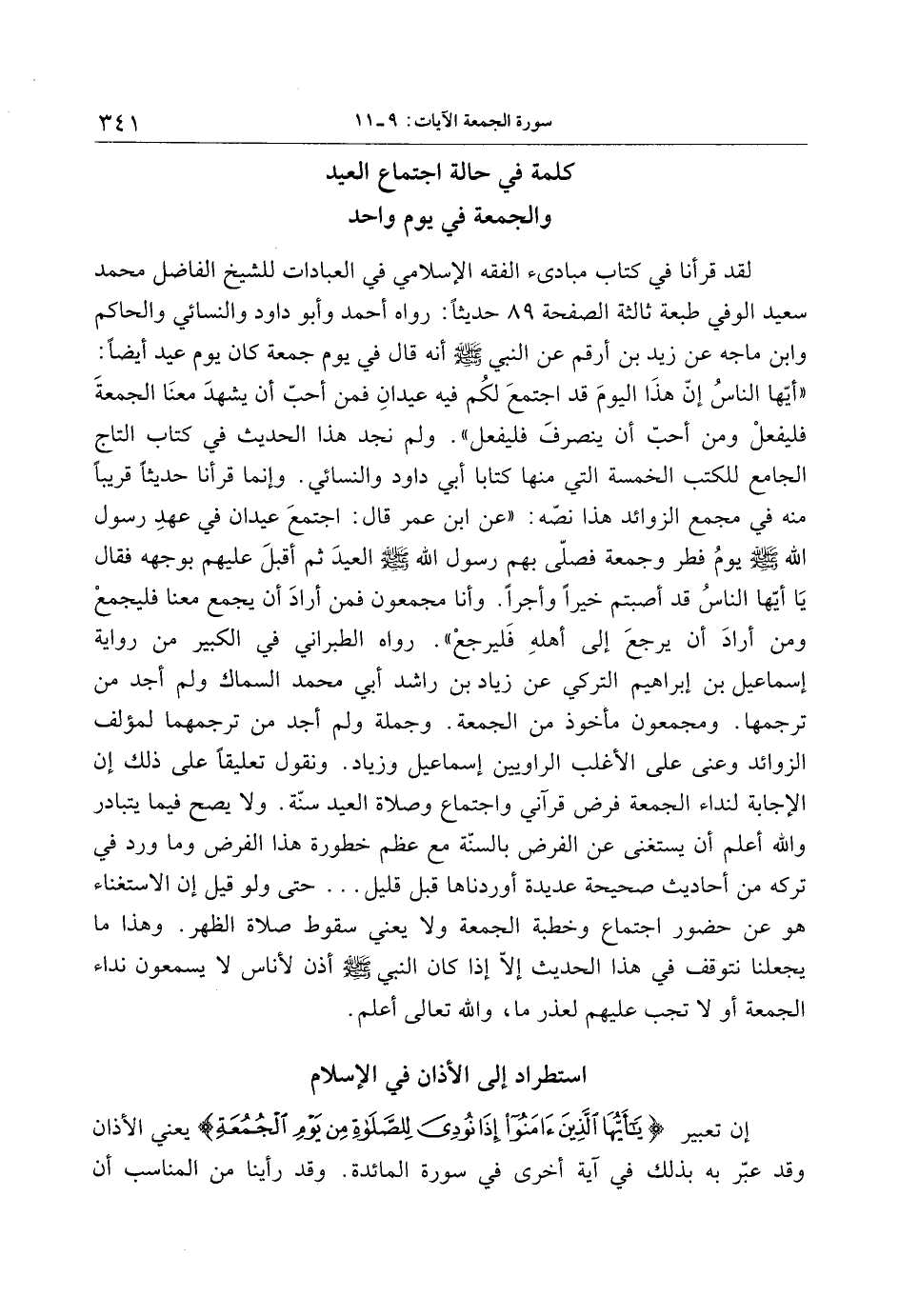 «أيّها الناس إنّ هذا اليوم قد اجتمع لكم فيه عيدان فمن أحبّ أن يشهد معنا الجمعة فليفعل ومن أحبّ أن ينصرف فليفعل» . ولم نجد هذا الحديث في كتاب التاج الجامع للكتب الخمسة التي منها كتابا أبي داود والنسائي. وإنما قرأنا حديثا قريبا منه في مجمع الزوائد هذا نصّه: «عن ابن عمر قال: اجتمع عيدان في عهد رسول الله صلى الله عليه وسلم يوم فطر وجمعة فصلّى بهم رسول الله صلى الله عليه وسلم العيد ثم أقبل عليهم بوجهه فقال يا أيّها الناس قد أصبتم خيرا وأجرا. وأنا مجمعون فمن أراد أن يجمع معنا فليجمع ومن أراد أن يرجع إلى أهله فليرجع» . رواه الطبراني في الكبير من رواية إسماعيل بن إبراهيم التركي عن زياد بن راشد أبي محمد السماك ولم أجد من ترجمها. ومجمعون مأخوذ من الجمعة. وجملة ولم أجد من ترجمهما لمؤلف الزوائد وعنى على الأغلب الراويين إسماعيل وزياد. ونقول تعليقا على ذلك إن الإجابة لنداء الجمعة فرض قرآني واجتماع وصلاة العيد سنّة. ولا يصح فيما يتبادر والله أعلم أن يستغنى عن الفرض بالسنّة مع عظم خطورة هذا الفرض وما ورد في تركه من أحاديث صحيحة عديدة أوردناها قبل قليل ... حتى ولو قيل إن الاستغناء هو عن حضور اجتماع وخطبة الجمعة ولا يعني سقوط صلاة الظهر. وهذا ما يجعلنا نتوقف في هذا الحديث إلّا إذا كان النبي صلى الله عليه وسلم أذن لأناس لا يسمعون نداء الجمعة أو لا تجب عليهم لعذر ما، والله تعالى أعلم.