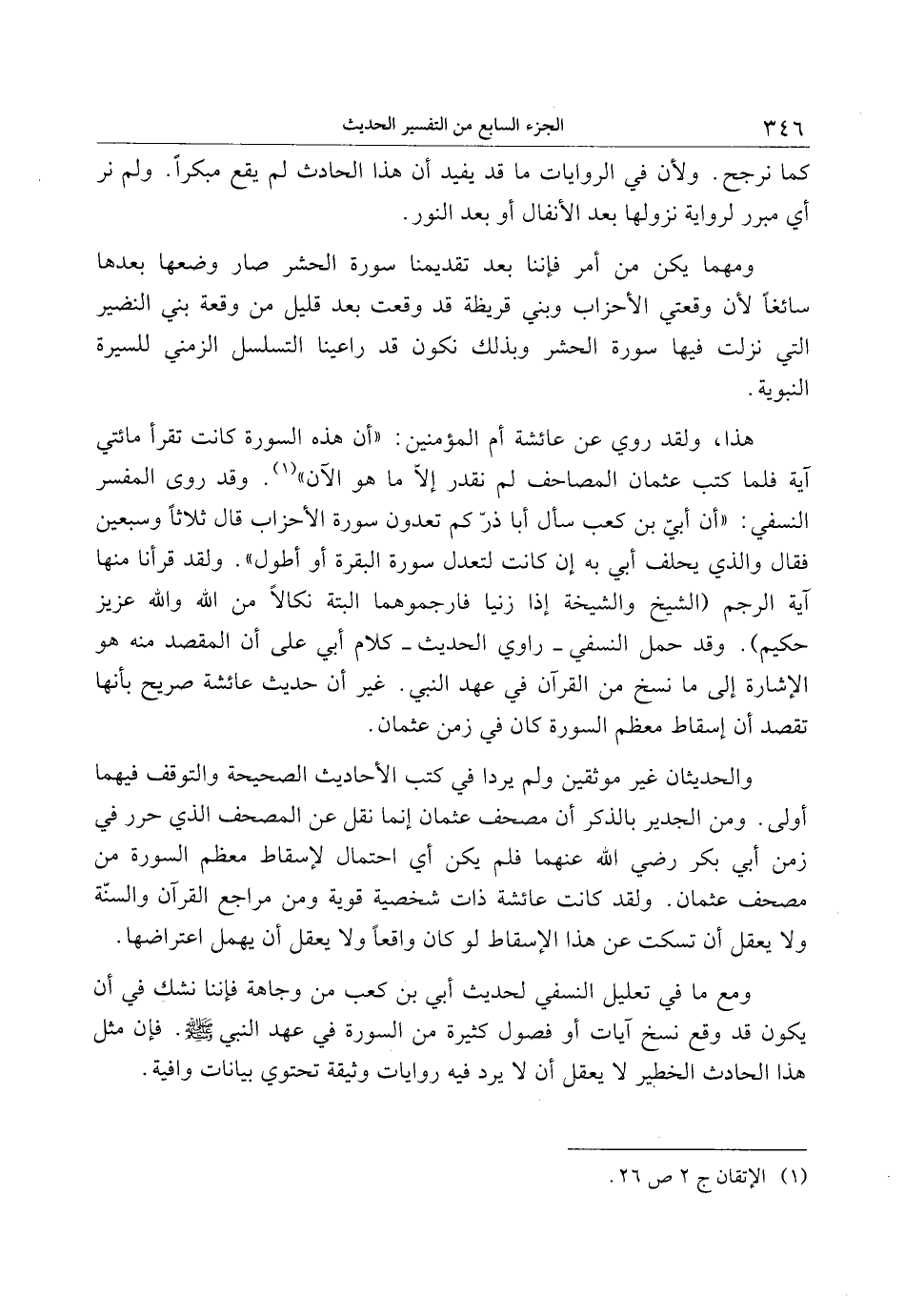ومع ما في تعليل النسفي لحديث أبي بن كعب من وجاهة فإننا نشك في أن يكون قد وقع نسخ آيات أو فصول كثيرة من السورة في عهد النبي صلى الله عليه وسلم. فإن مثل هذا الحادث الخطير لا يعقل أن لا يرد فيه روايات وثيقة تحتوي بيانات وافية.