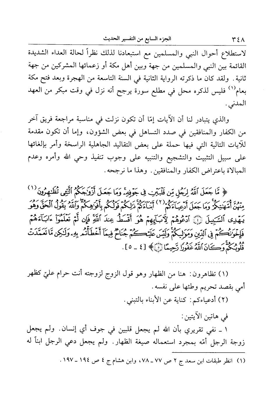 ما جَعَلَ اللَّهُ لِرَجُلٍ مِنْ قَلْبَيْنِ فِي جَوْفِهِ وَما جَعَلَ أَزْواجَكُمُ اللاَّئِي تُظاهِرُونَ مِنْهُنَّ أُمَّهاتِكُمْ وَما جَعَلَ أَدْعِياءَكُمْ أَبْناءَكُمْ ذلِكُمْ قَوْلُكُمْ بِأَفْواهِكُمْ وَاللَّهُ يَقُولُ الْحَقَّ وَهُوَ يَهْدِي السَّبِيلَ (4) ادْعُوهُمْ لِآبائِهِمْ هُوَ أَقْسَطُ عِنْدَ اللَّهِ فَإِنْ لَمْ تَعْلَمُوا آباءَهُمْ فَإِخْوانُكُمْ فِي الدِّينِ وَمَوالِيكُمْ وَلَيْسَ عَلَيْكُمْ جُناحٌ فِيما أَخْطَأْتُمْ بِهِ وَلكِنْ ما تَعَمَّدَتْ قُلُوبُكُمْ وَكانَ اللَّهُ غَفُوراً رَحِيماً (5)