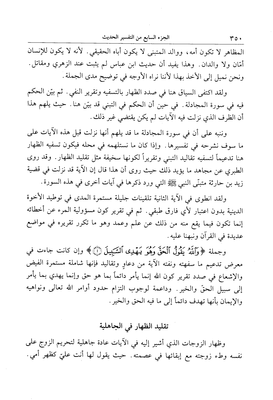 ولقد اكتفى السياق هنا في صدد الظهار بالتسفيه وتقرير النفي. ثم بيّن الحكم فيه في سورة المجادلة. في حين أن الحكم في التبني قد بيّن هنا. حيث يلهم هذا أن الظرف الذي نزلت فيه الآيات لم يكن يقتضي غير ذلك.