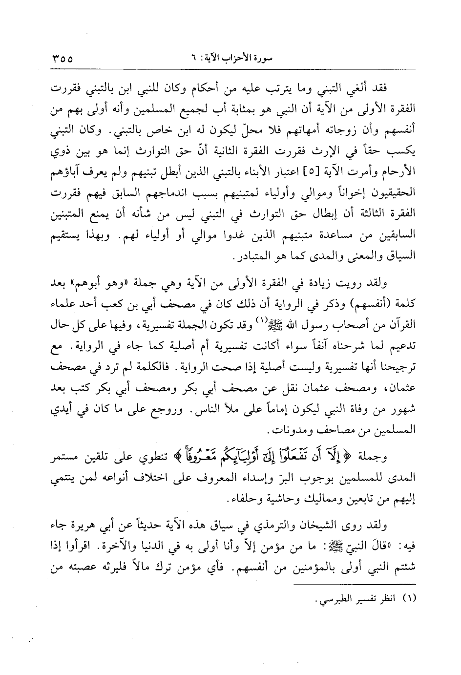 ولقد رويت زيادة في الفقرة الأولى من الآية وهي جملة «وهو أبوهم» بعد كلمة (أنفسهم) وذكر في الرواية أن ذلك كان في مصحف أبي بن كعب أحد علماء القرآن من أصحاب رسول الله صلى الله عليه وسلم «1» وقد تكون الجملة تفسيرية، وفيها على كل حال تدعيم لما شرحناه آنفا سواء أكانت تفسيرية أم أصلية كما جاء في الرواية. مع ترجيحنا أنها تفسيرية وليست أصلية إذا صحت الرواية. فالكلمة لم ترد في مصحف عثمان، ومصحف عثمان نقل عن مصحف أبي بكر ومصحف أبي بكر كتب بعد شهور من وفاة النبي ليكون إماما على ملأ الناس. وروجع على ما كان في أيدي المسلمين من مصاحف ومدونات.