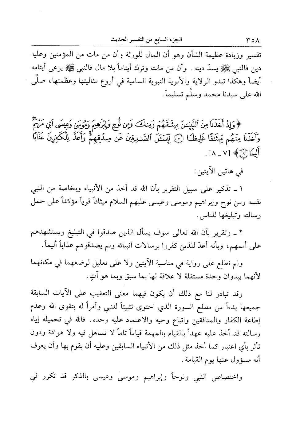 وَإِذْ أَخَذْنا مِنَ النَّبِيِّينَ مِيثاقَهُمْ وَمِنْكَ وَمِنْ نُوحٍ وَإِبْراهِيمَ وَمُوسى وَعِيسَى ابْنِ مَرْيَمَ وَأَخَذْنا مِنْهُمْ مِيثاقاً غَلِيظاً (7) لِيَسْئَلَ الصَّادِقِينَ عَنْ صِدْقِهِمْ وَأَعَدَّ لِلْكافِرِينَ عَذاباً أَلِيماً (8)