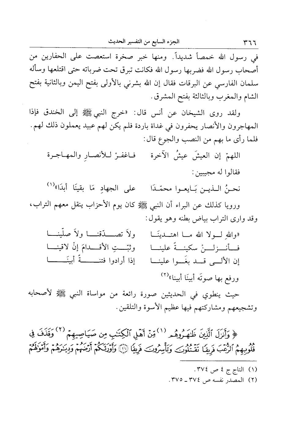 «1» ورويا كذلك عن البراء أن النبي صلى الله عليه وسلم كان يوم الأحزاب ينقل معهم التراب، وقد وارى التراب بياض بطنه وهو يقول: