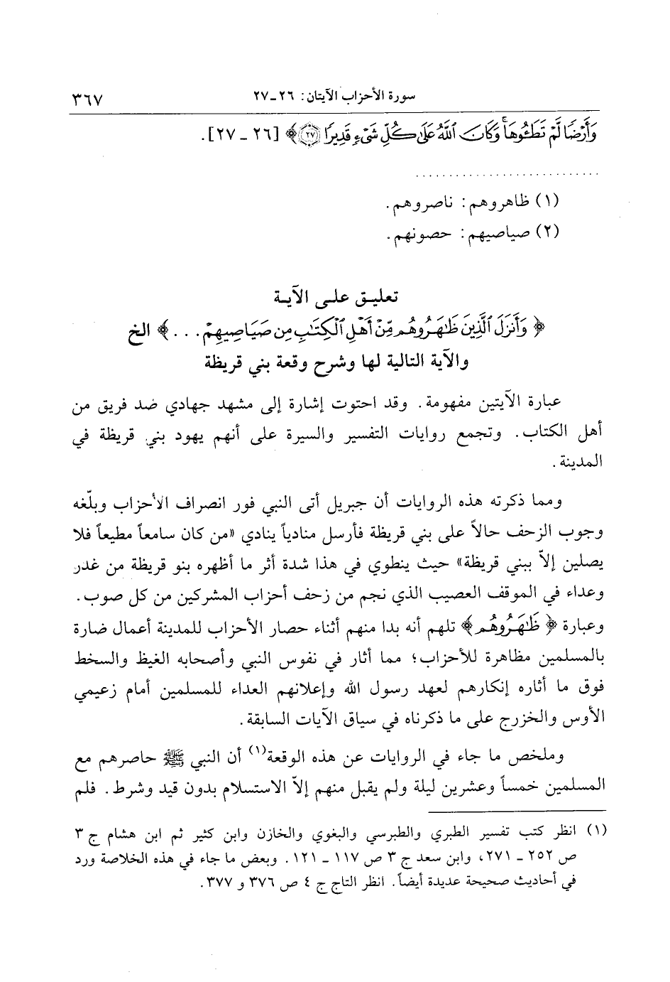تعليق على الآية وَأَنْزَلَ الَّذِينَ ظاهَرُوهُمْ مِنْ أَهْلِ الْكِتابِ مِنْ صَياصِيهِمْ ... إلخ والآية التالية لها وشرح وقعة بني قريظة