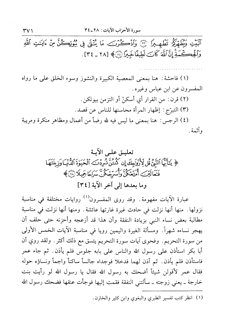 تعليق على الآية يا أَيُّهَا النَّبِيُّ قُلْ لِأَزْواجِكَ إِنْ كُنْتُنَّ تُرِدْنَ الْحَياةَ الدُّنْيا وَزِينَتَها فَتَعالَيْنَ أُمَتِّعْكُنَّ وَأُسَرِّحْكُنَّ سَراحاً جَمِيلًا (28) وما بعدها إلى آخر الآية [34]